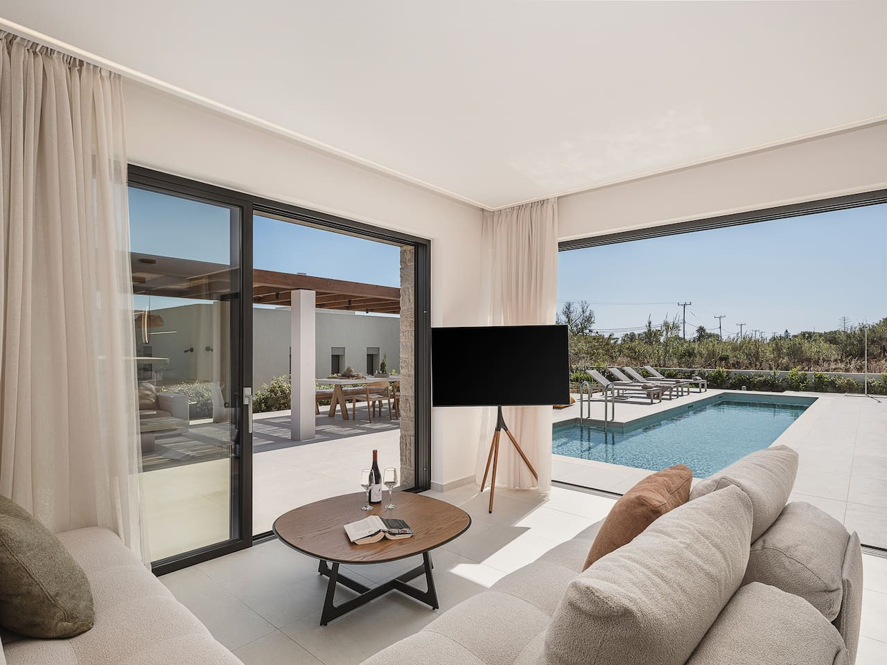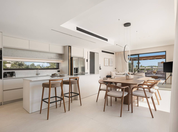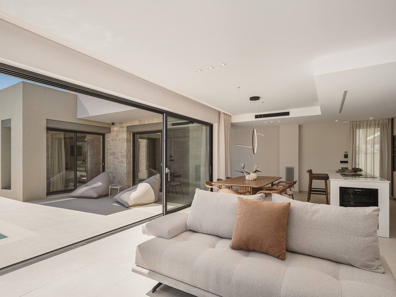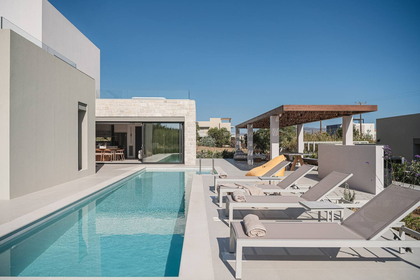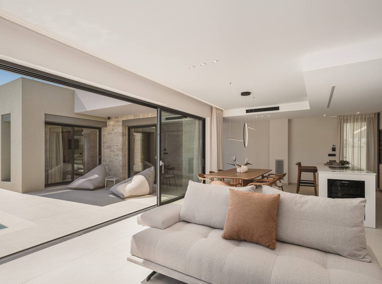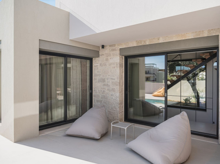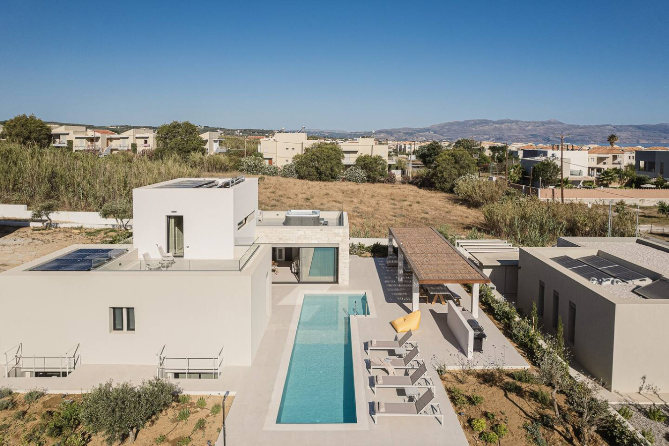 The design focuses on modern sustainability and comfort. Solar-powered systems, A++ energy efficiency and a chemical-free salt-based pool ensure a high-end experience with minimal environmental footprint. From the heated pool and upper-level Jacuzzi to multiple terraces overlooking the coastline, every area is created to elevate the feeling of slow coastal living.