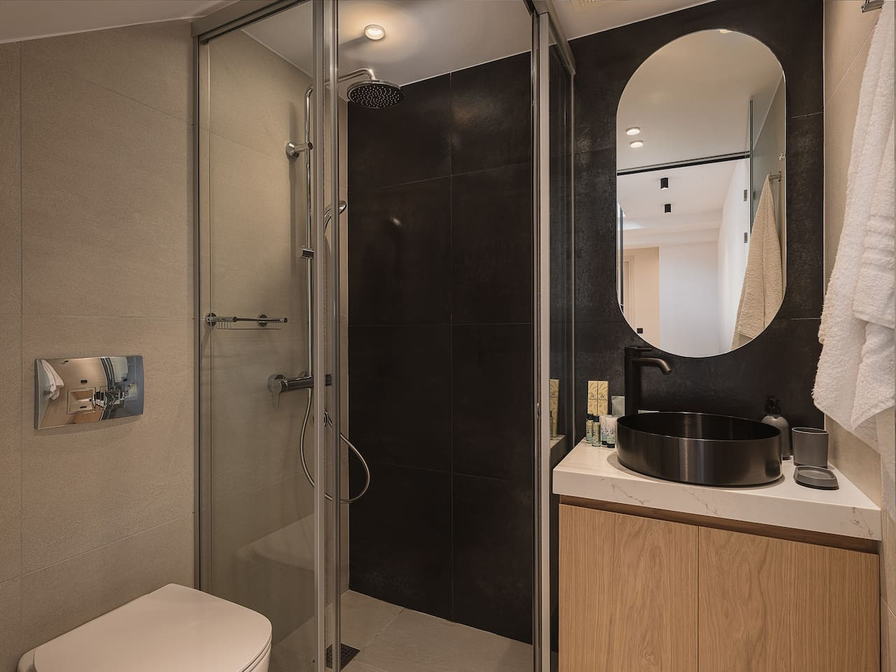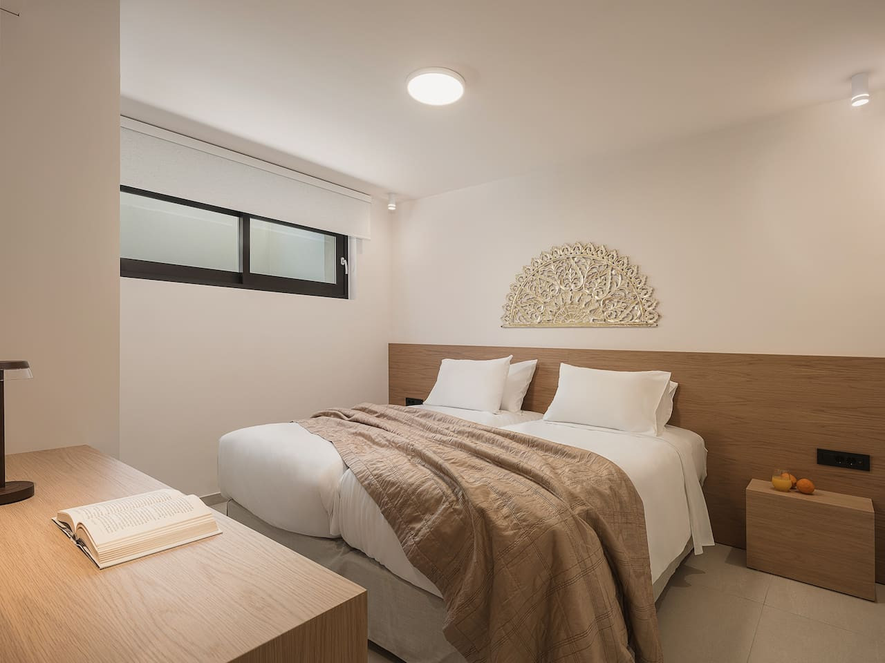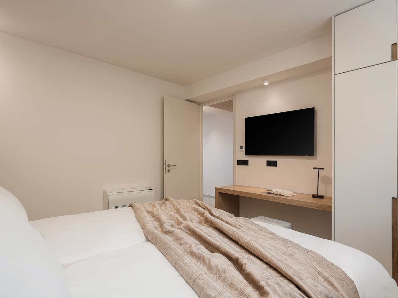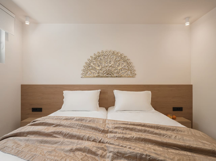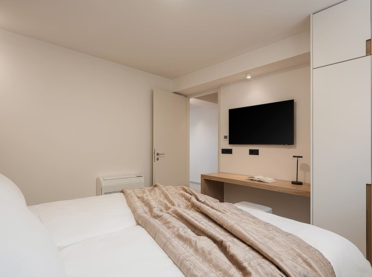 Two elegantly styled bedrooms with ensuite bathrooms, one with a queen-size bed and the other with twin beds that can be converted into a queen. A bright living and dining area, fully equipped kitchen with modern appliances and wine fridge, and direct access to private outdoor seating areas. The layout also includes wheelchair-friendly access.