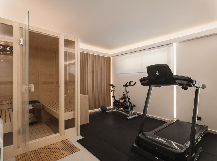 An additional bedroom with convertible twin beds, quiet workspace and a full bathroom. The level also includes a private gym, sauna and a fully equipped laundry room.