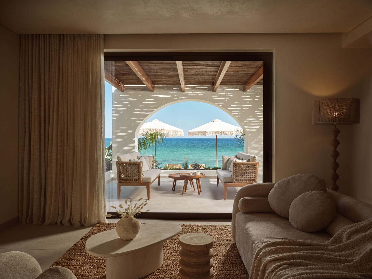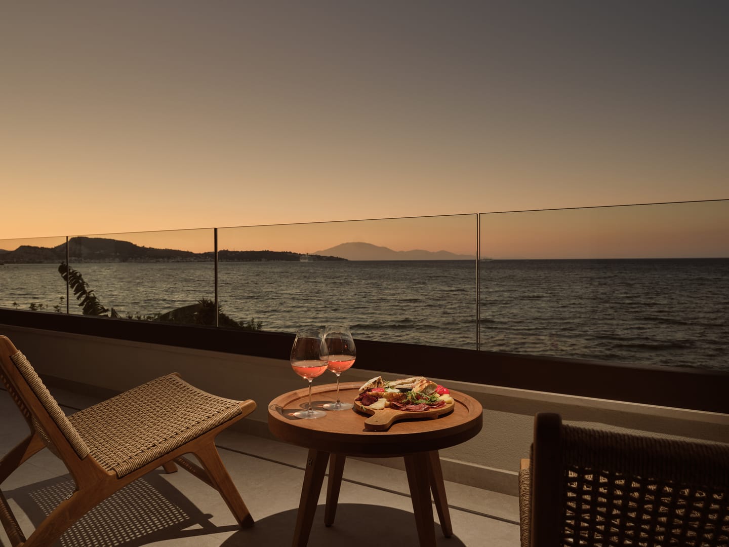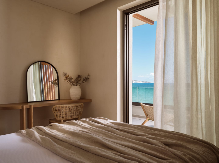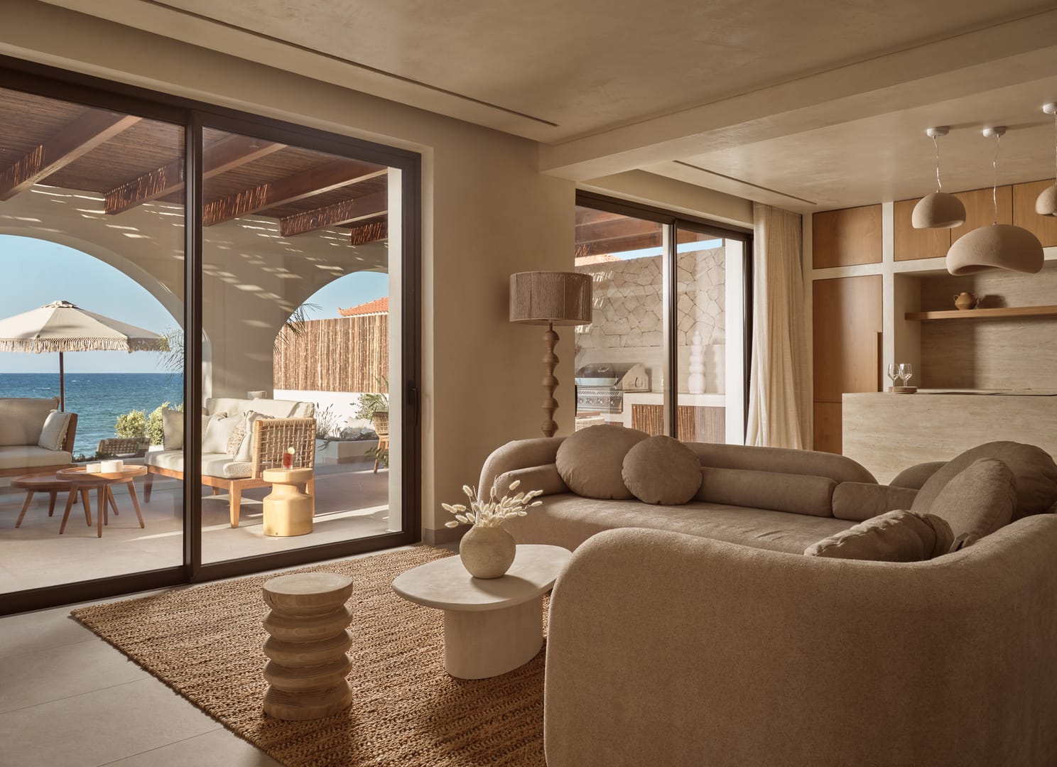 Large windows frame uninterrupted sea views, ensuring every morning begins with soft Ionian light and the calming presence of the water below.