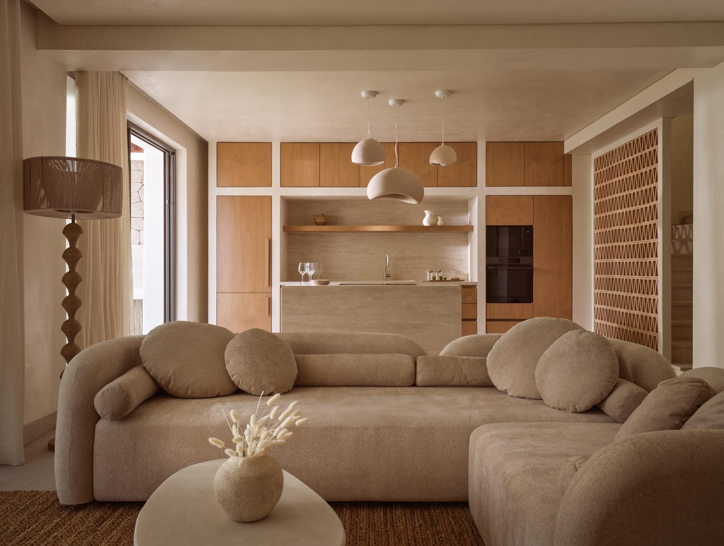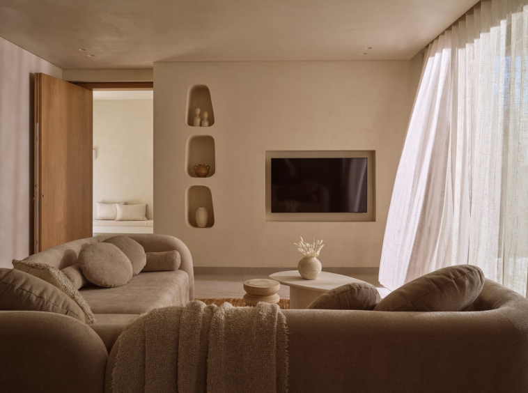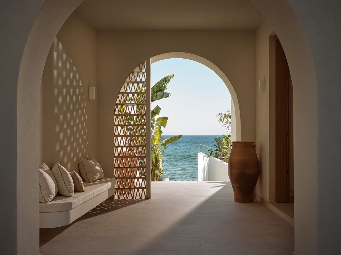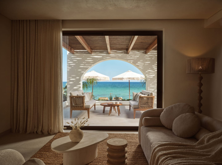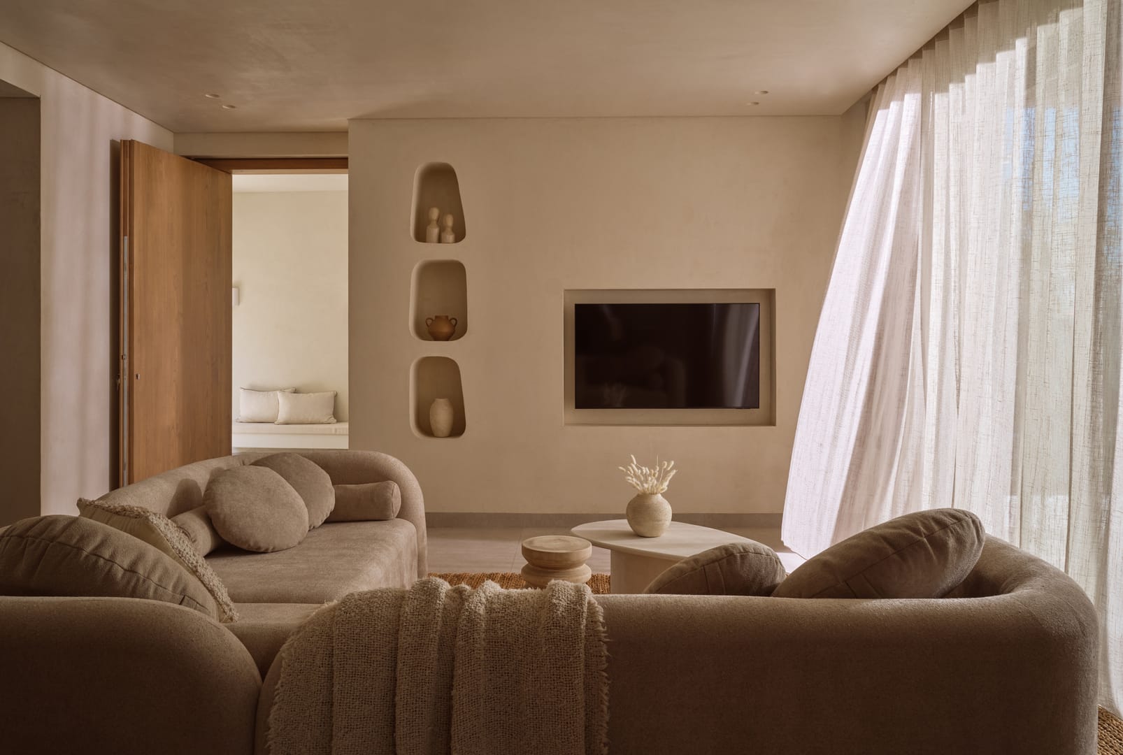 Large windows frame uninterrupted sea views, ensuring every morning begins with soft Ionian light and the calming presence of the water below.