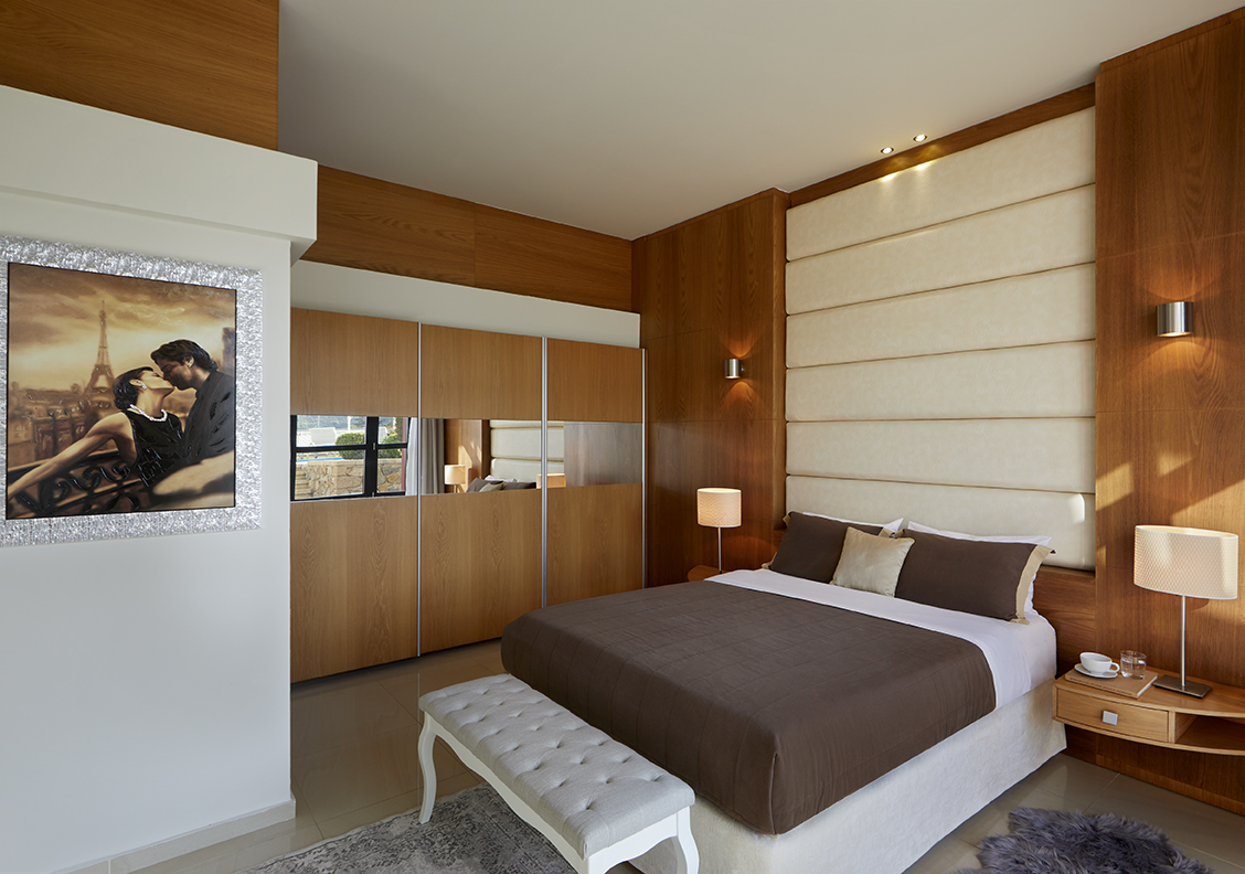 It includes four beautifully appointed bedrooms — three with double beds and one with a semi-double — each decorated with unique design elements, featuring satellite TV and spacious balconies.