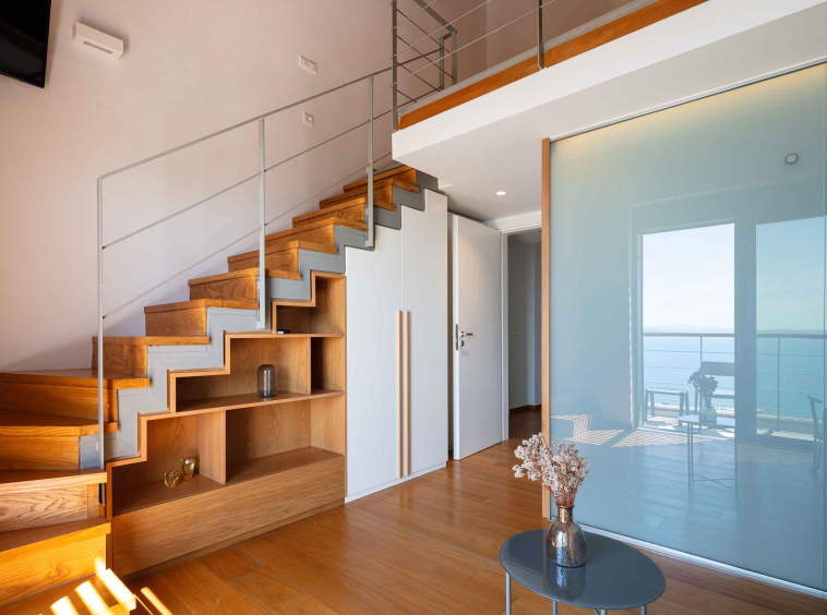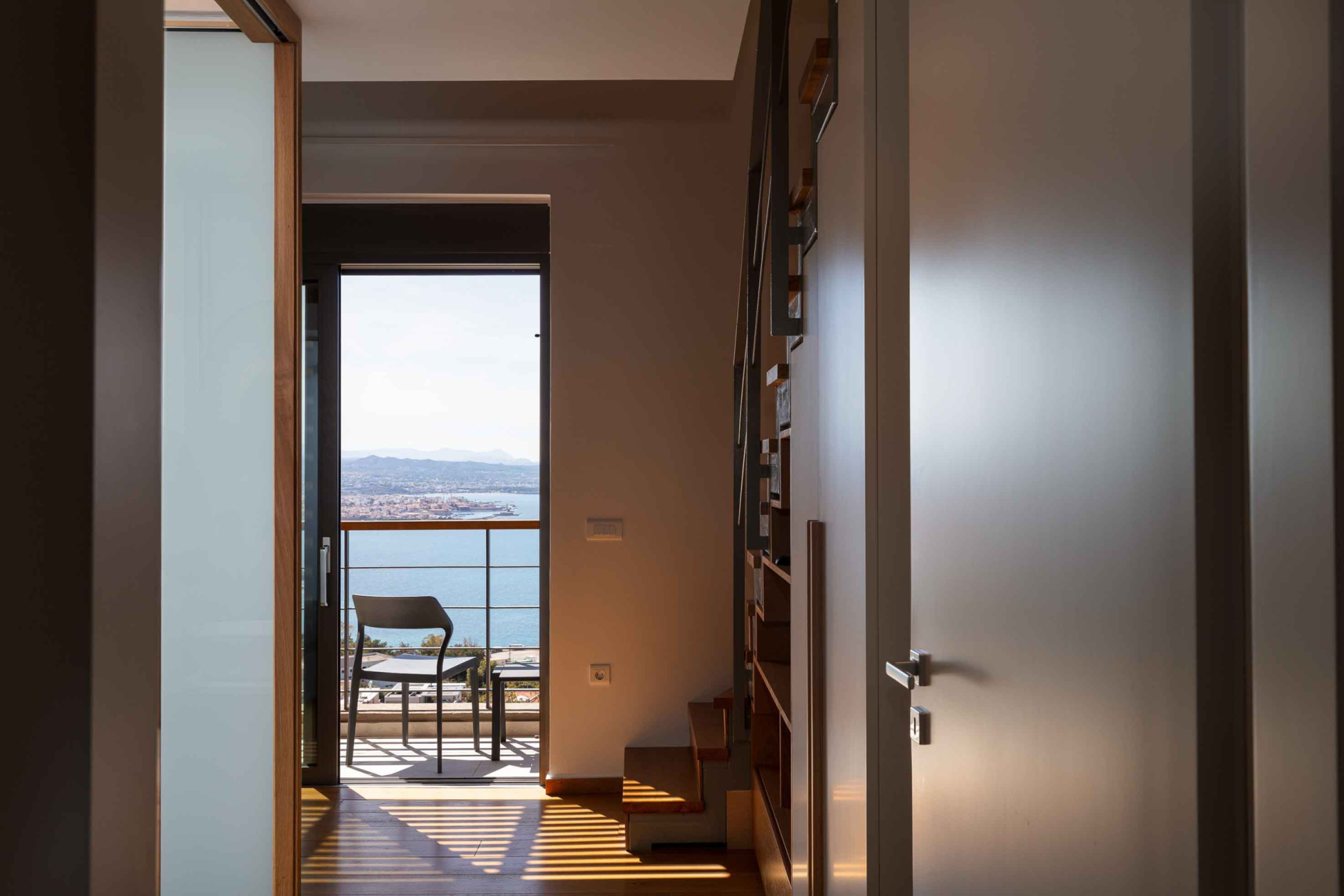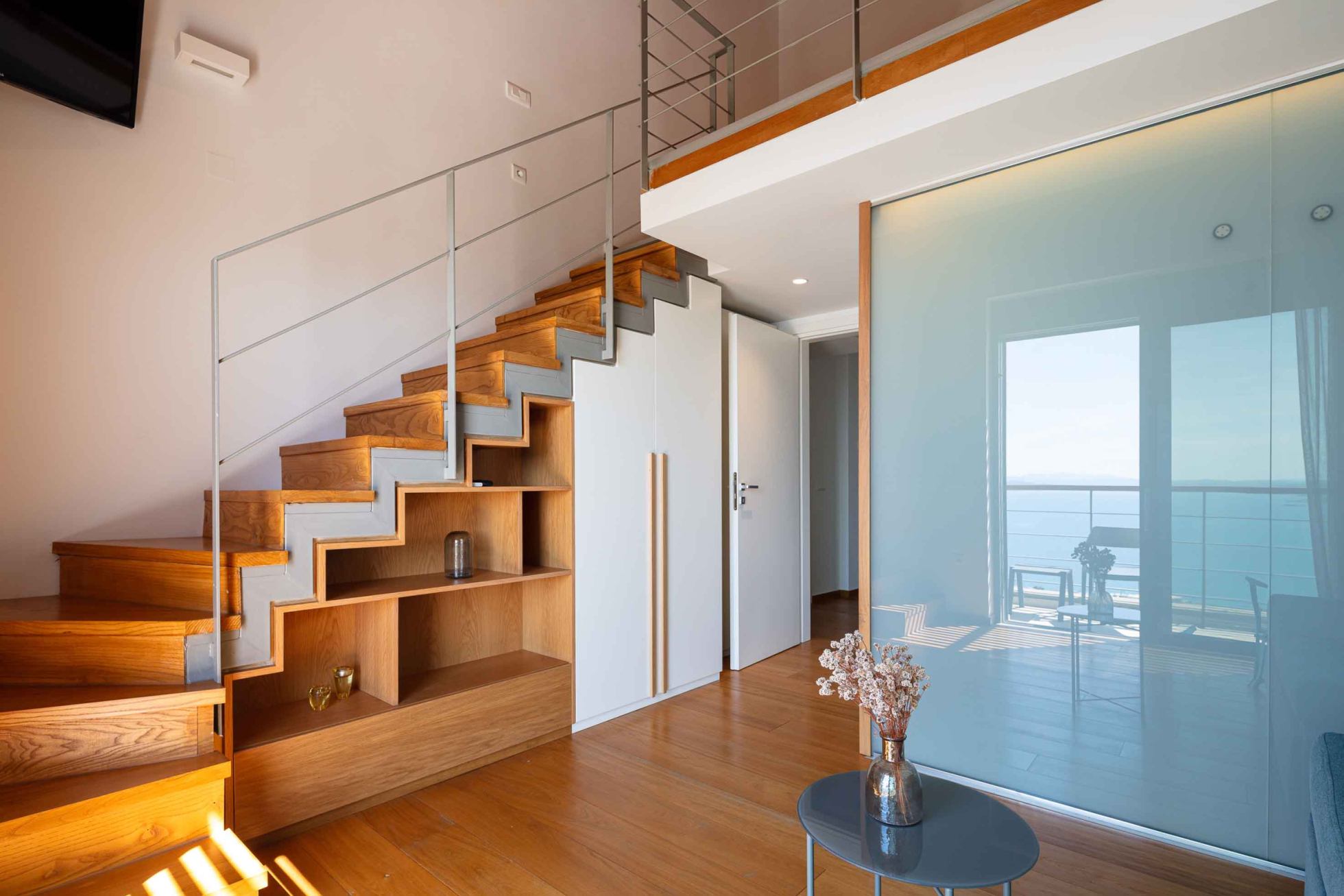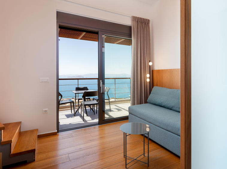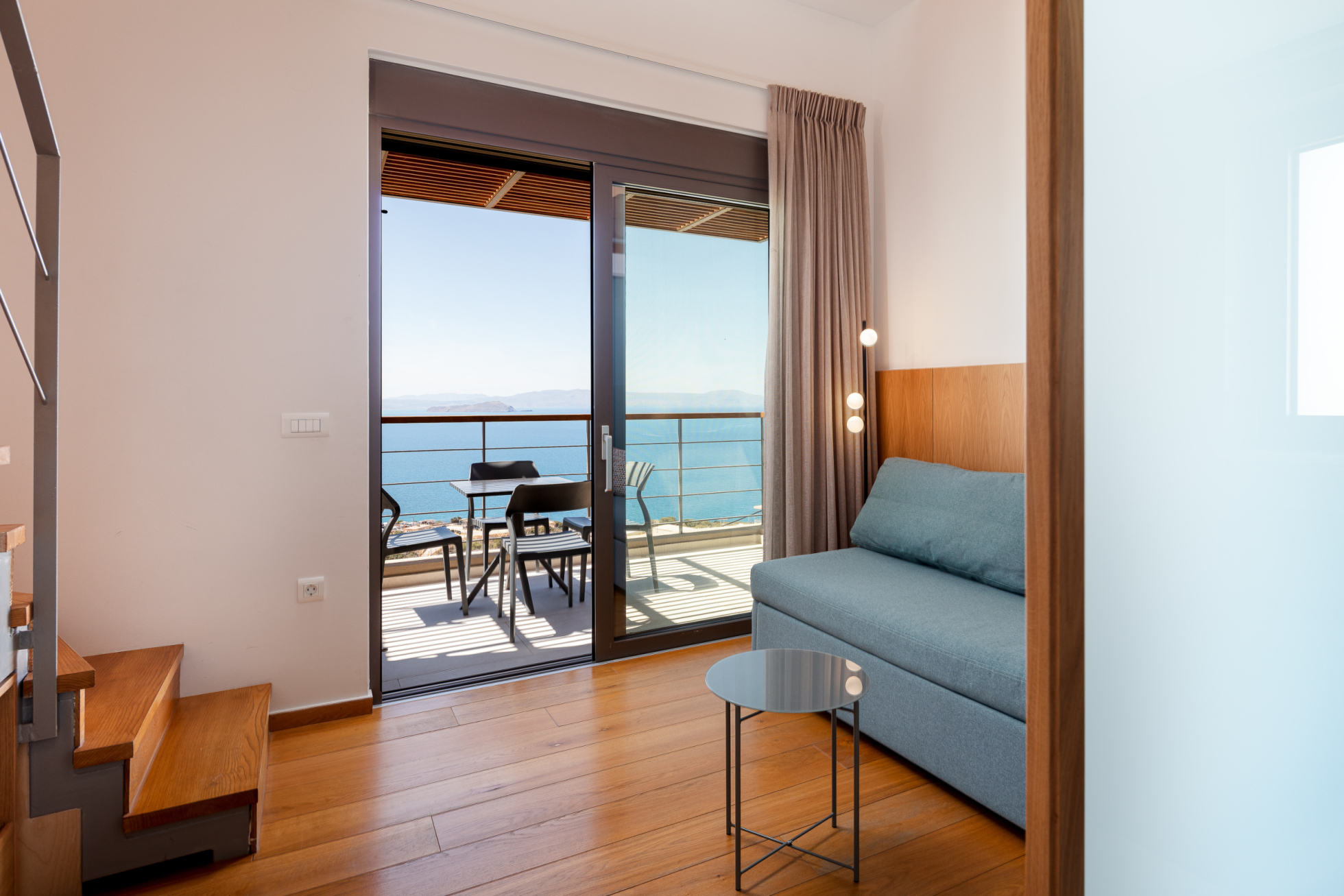 – Living area with sofa, energy fireplace, sea view, and access to the pool terrace