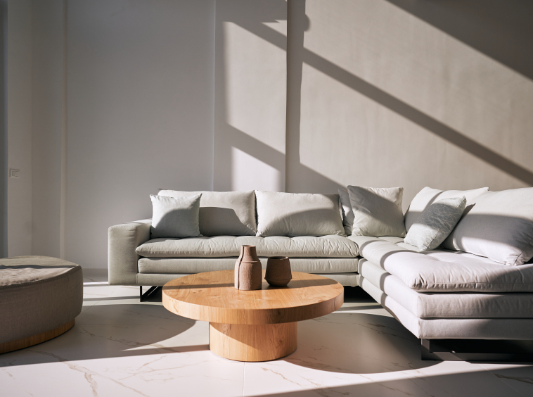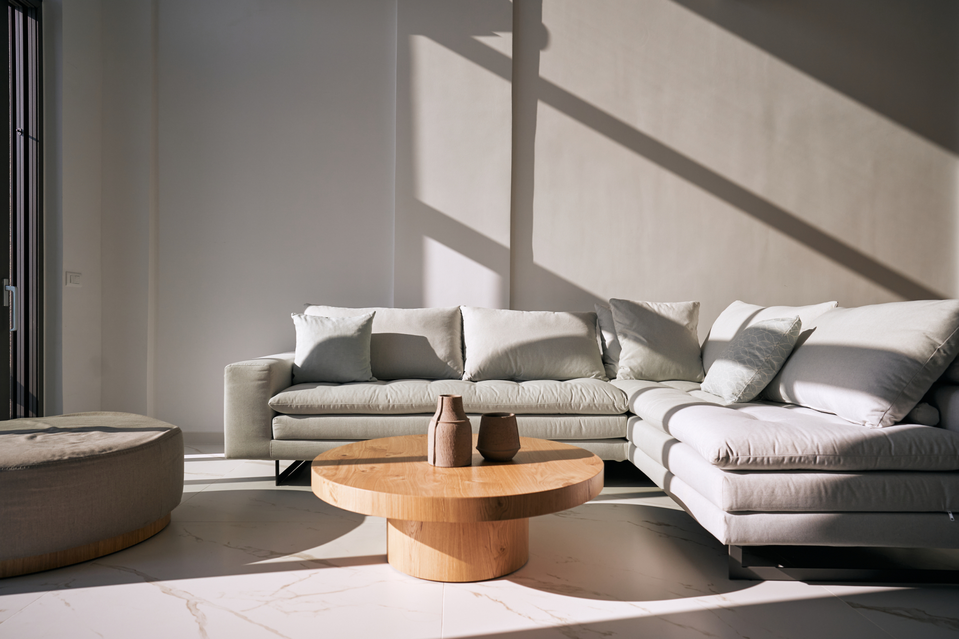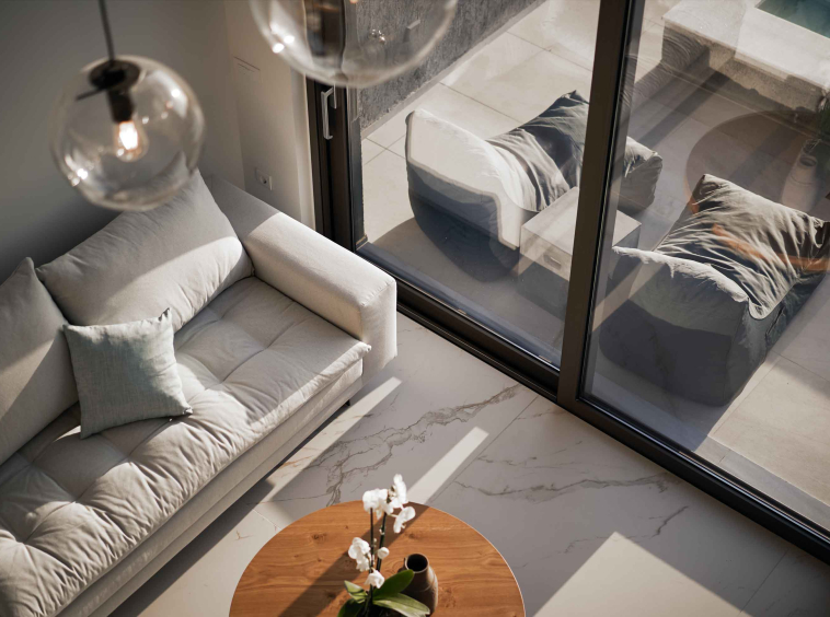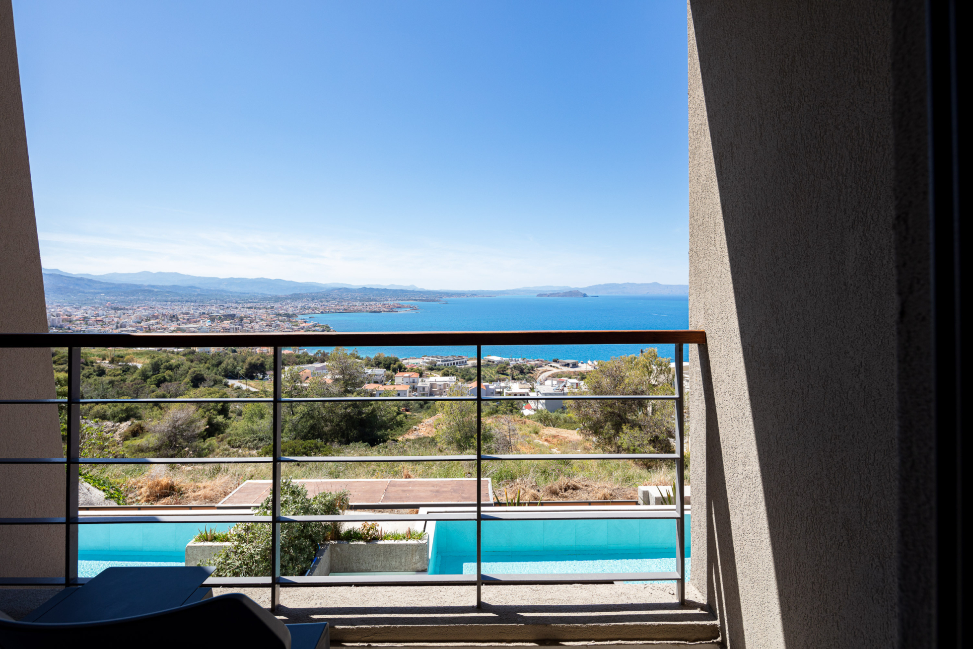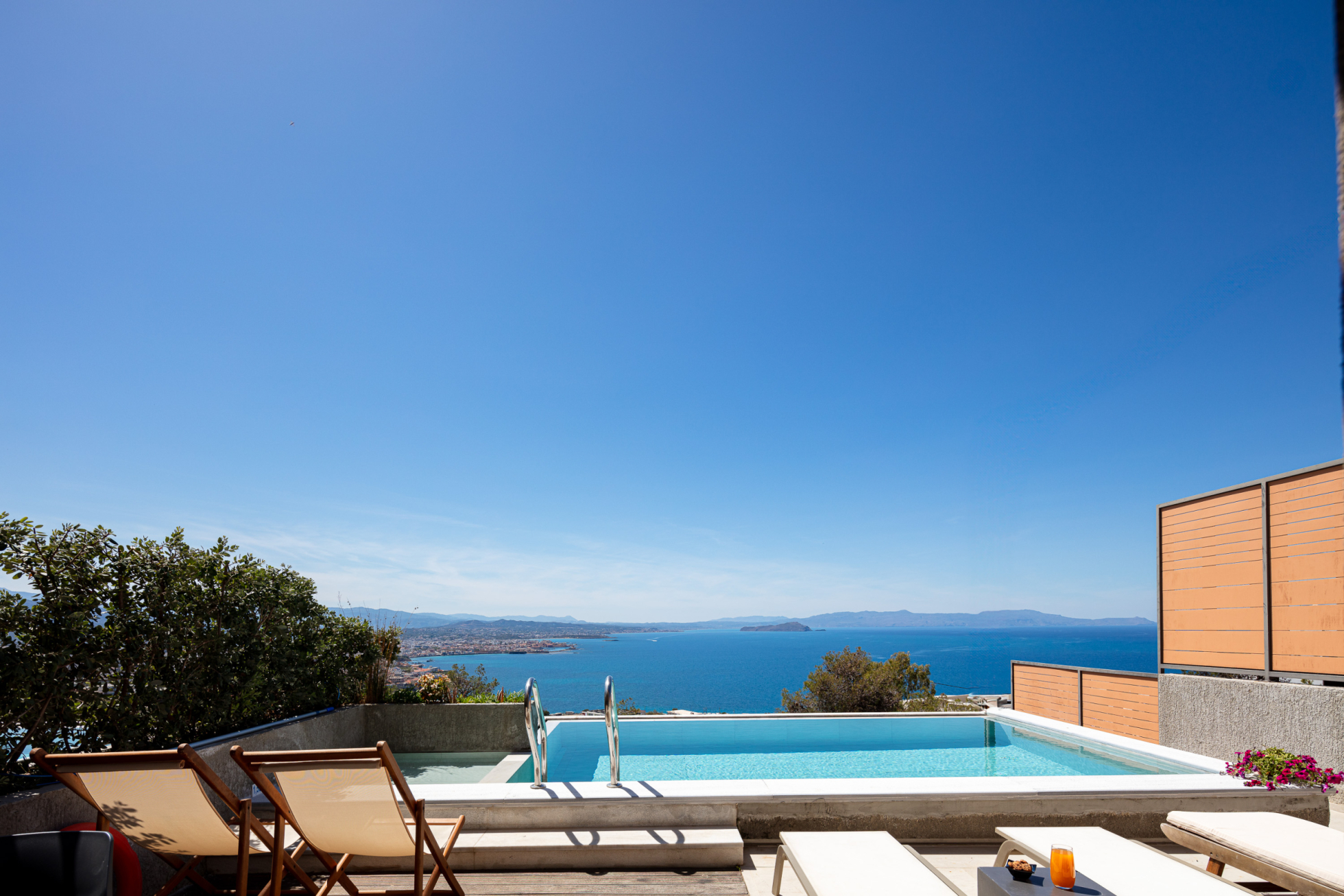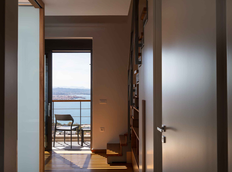 – Living area with sofa, energy fireplace, sea view, and access to the pool terrace