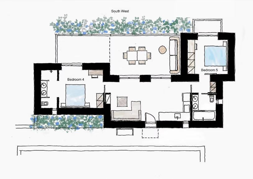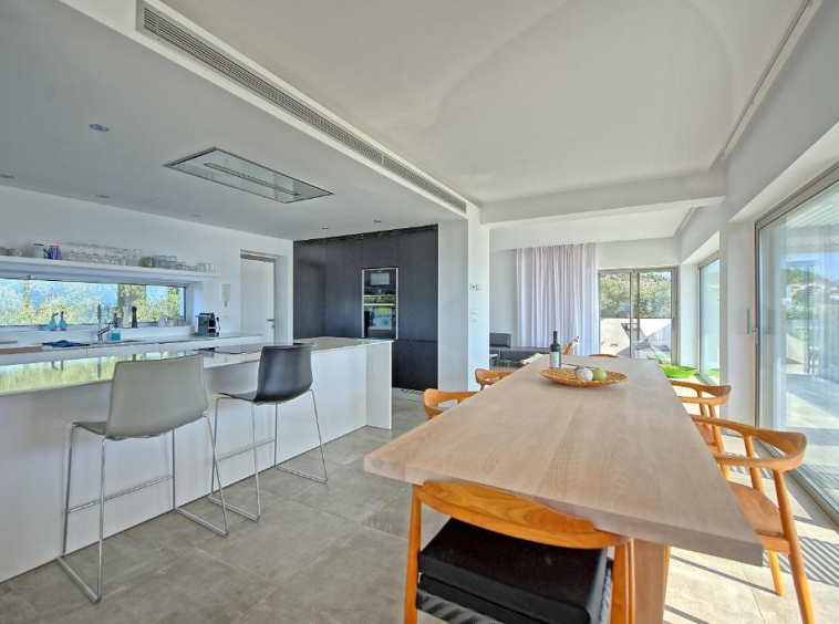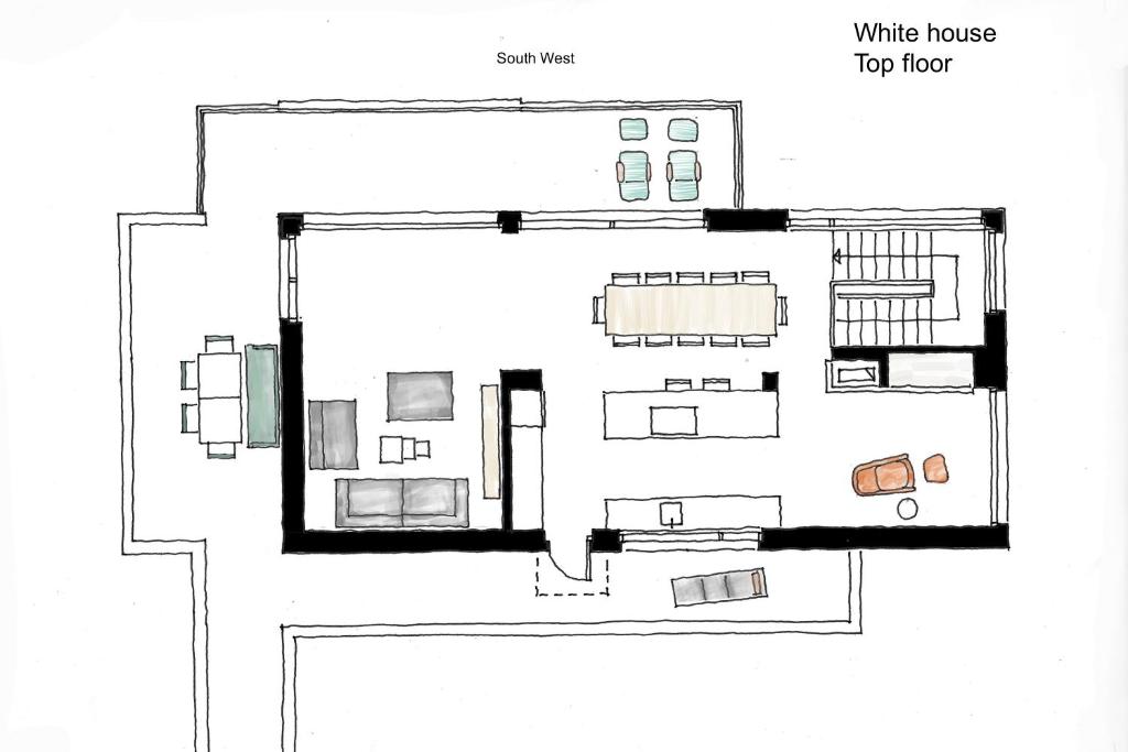 The top floor of the White House offers an open-plan living room and kitchen, with a spacious dining area designed to welcome large gatherings — comfortably hosting up to 30 guests when needed.