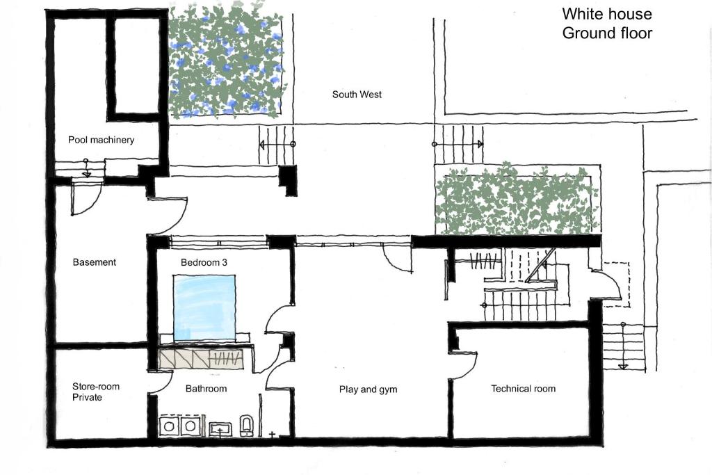 From the outside there is access to a bicycle garage and technical room for the pool.