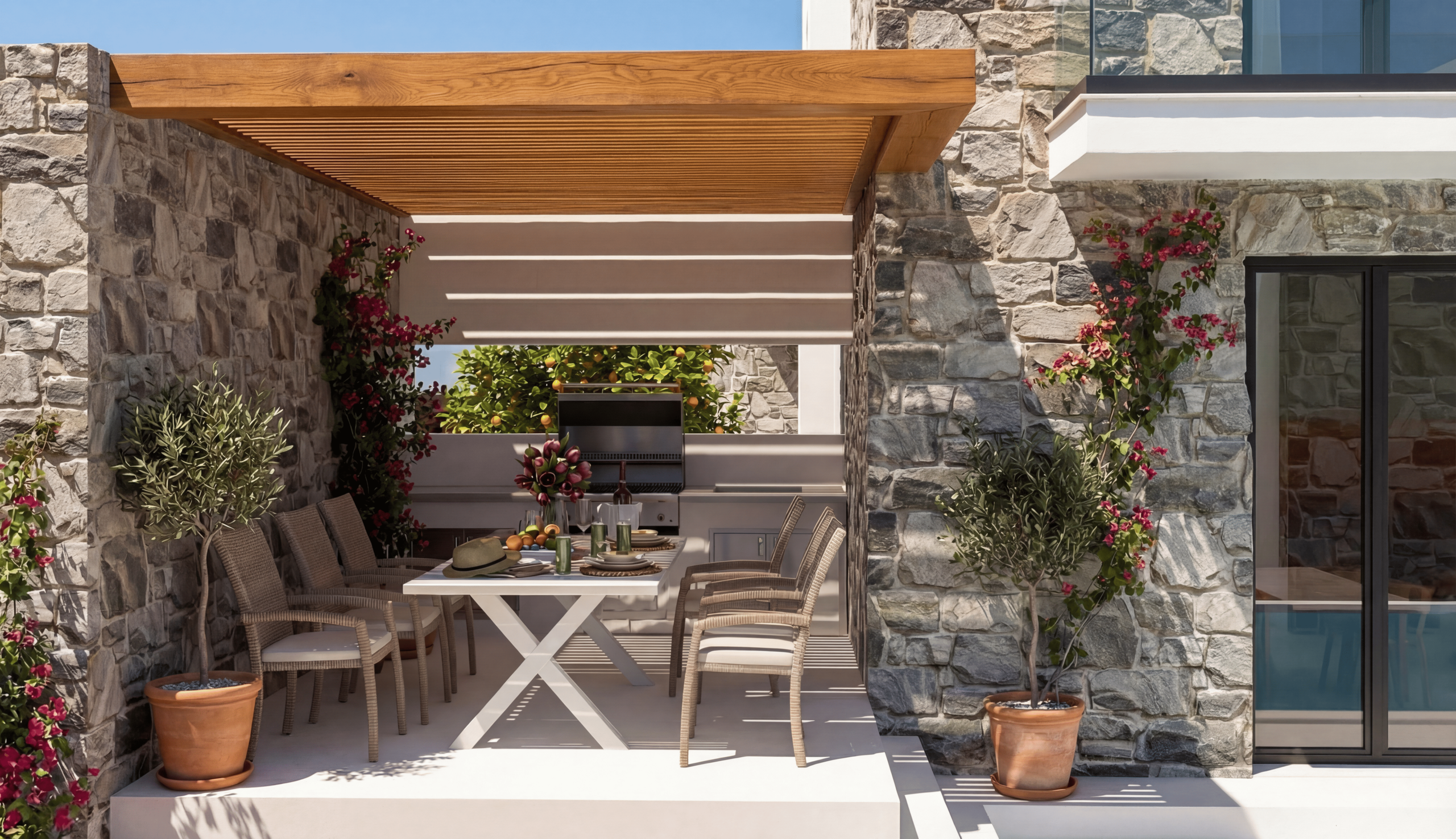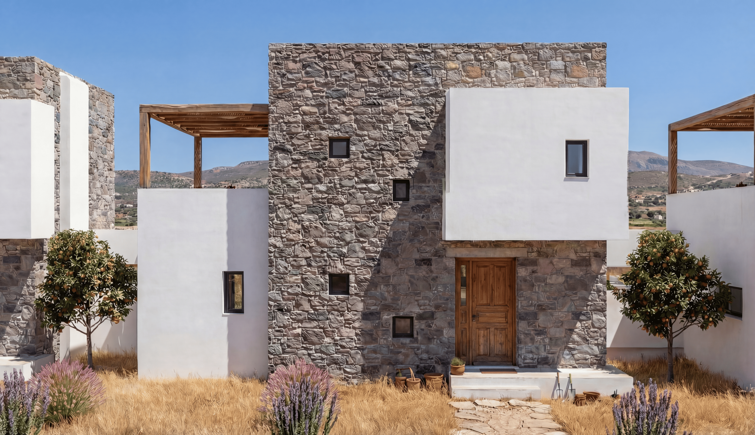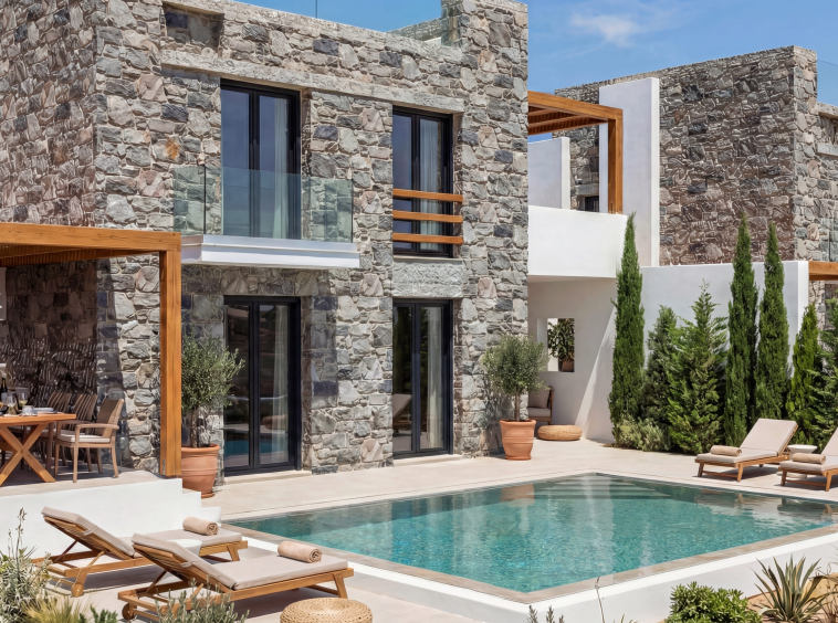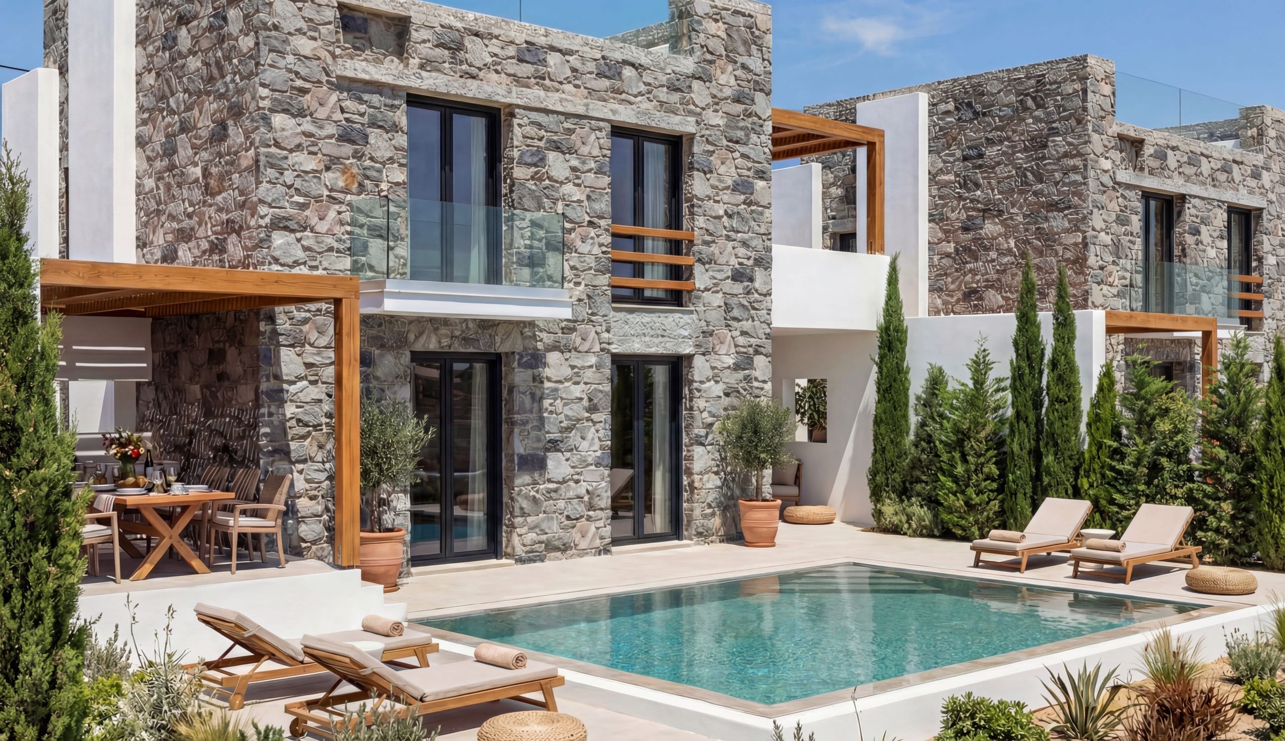 Natural stone construction, clean lines and carefully planned outdoor spaces create a timeless aesthetic that blends seamlessly into the surrounding landscape.