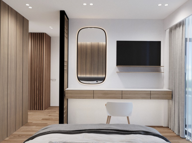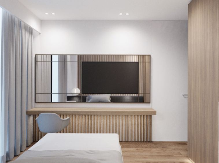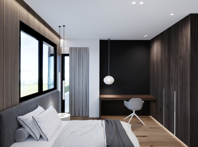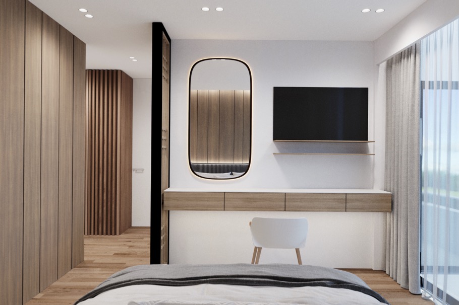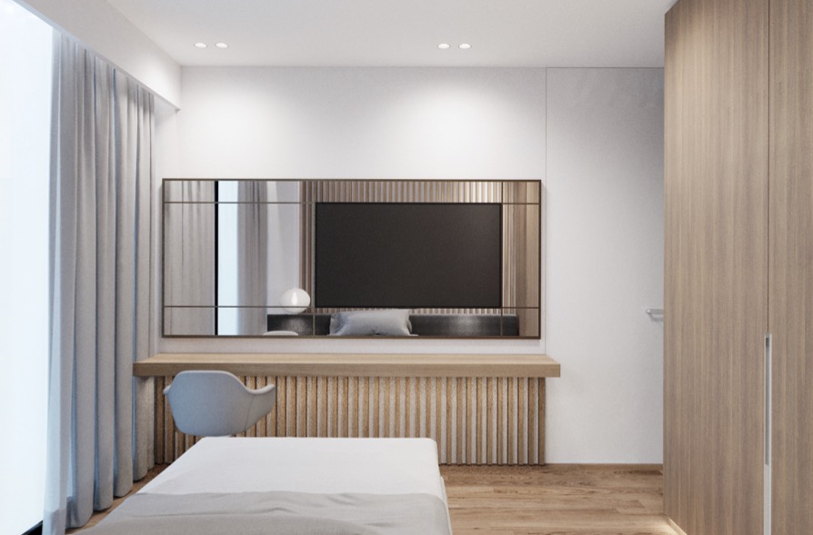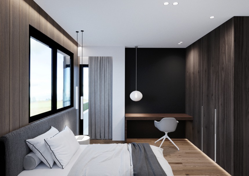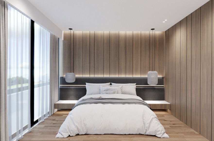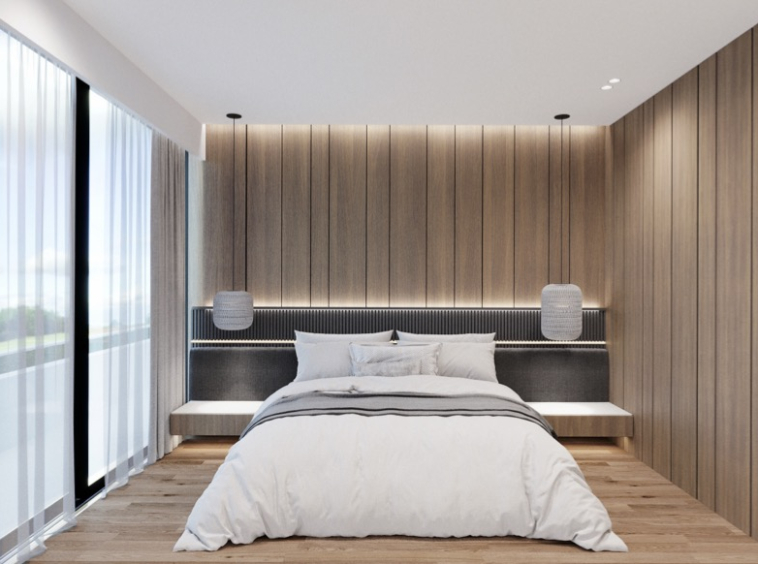 Large windows bring brightness throughout the day, while the elevated placement reinforces a calm, airy atmosphere.