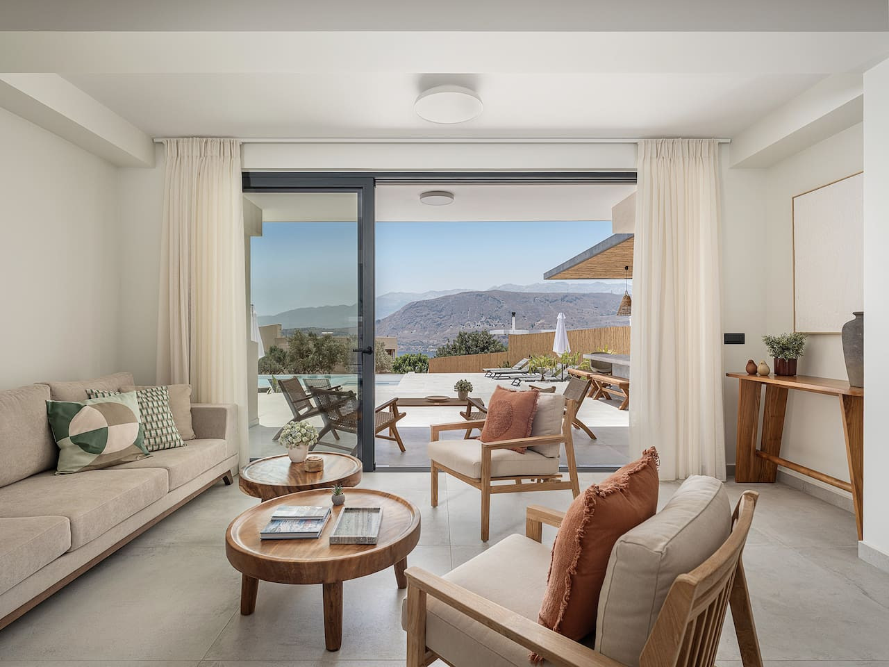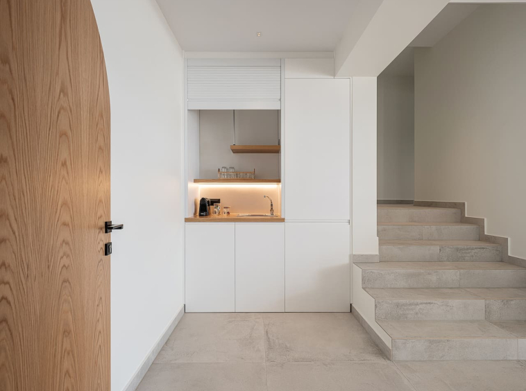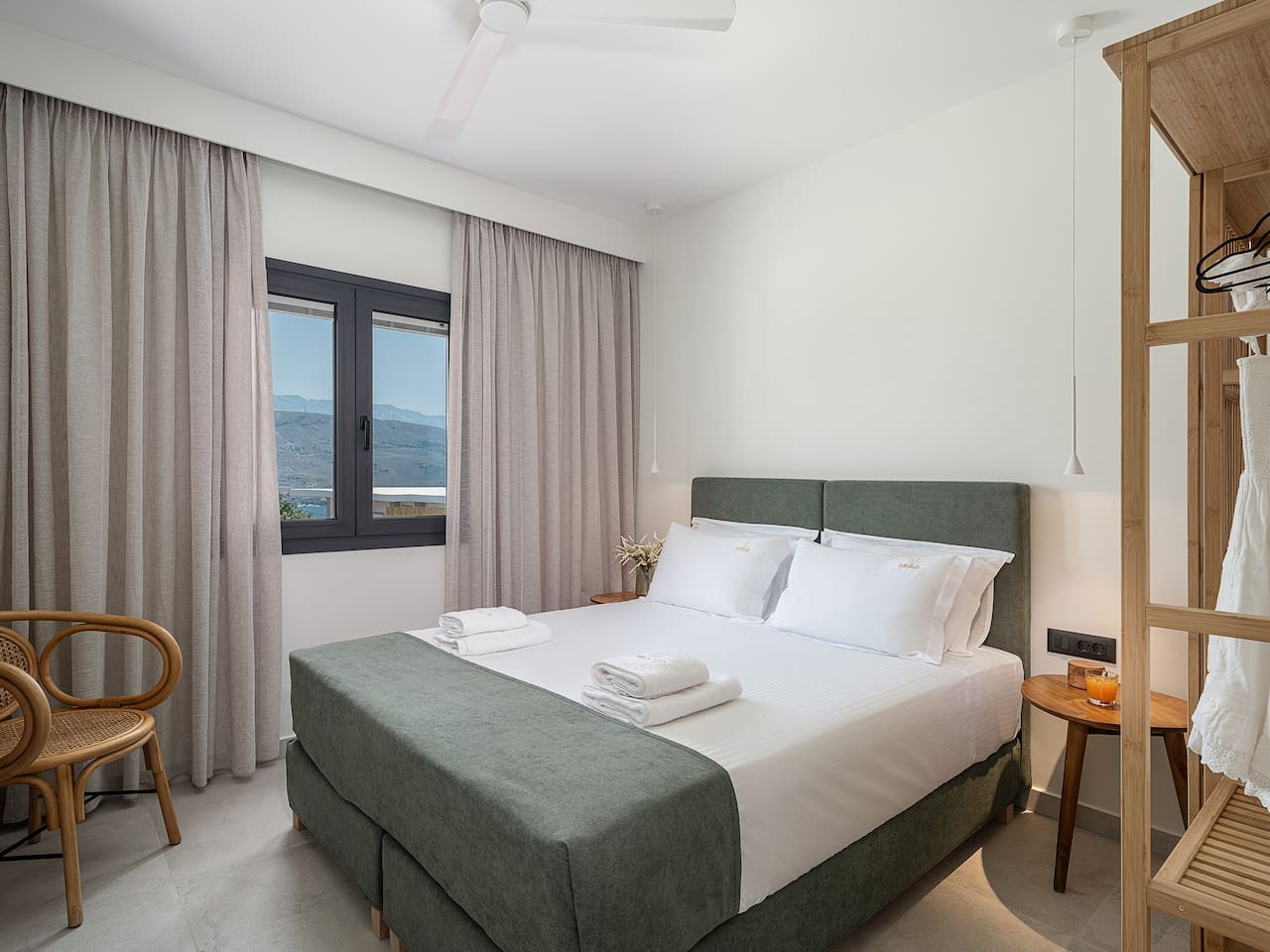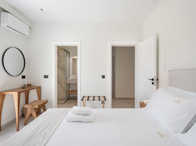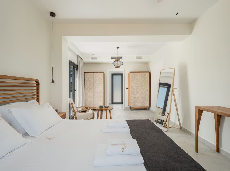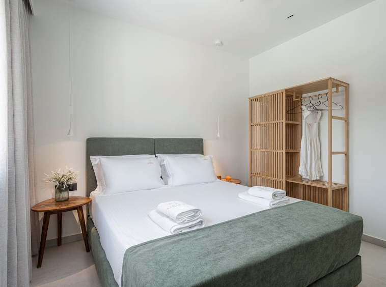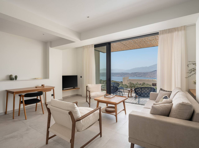 The architecture focuses on harmony and openness. Large windows frame the view of Souda Bay, while multiple lounge areas and secluded corners allow guests to unwind in complete privacy. Coco-Mat natural sleep systems and high-quality furnishings elevate every detail of the stay.