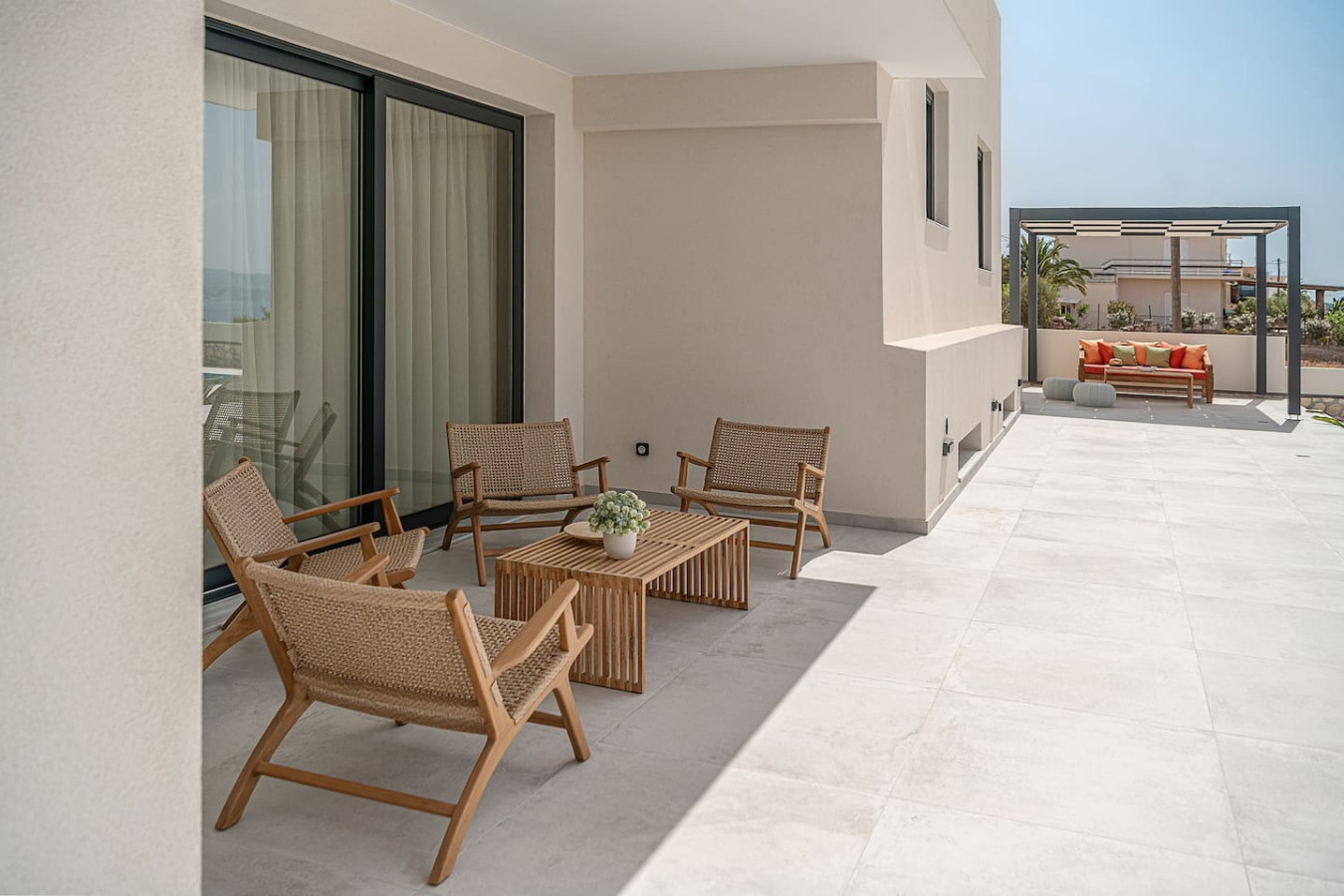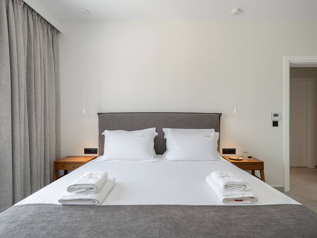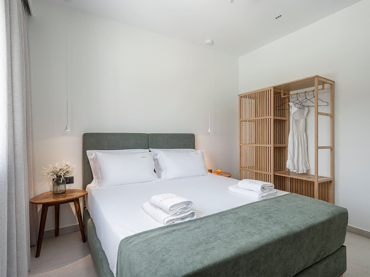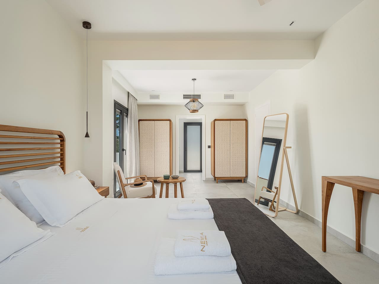 The architecture focuses on harmony and openness. Large windows frame the view of Souda Bay, while multiple lounge areas and secluded corners allow guests to unwind in complete privacy. Coco-Mat natural sleep systems and high-quality furnishings elevate every detail of the stay.