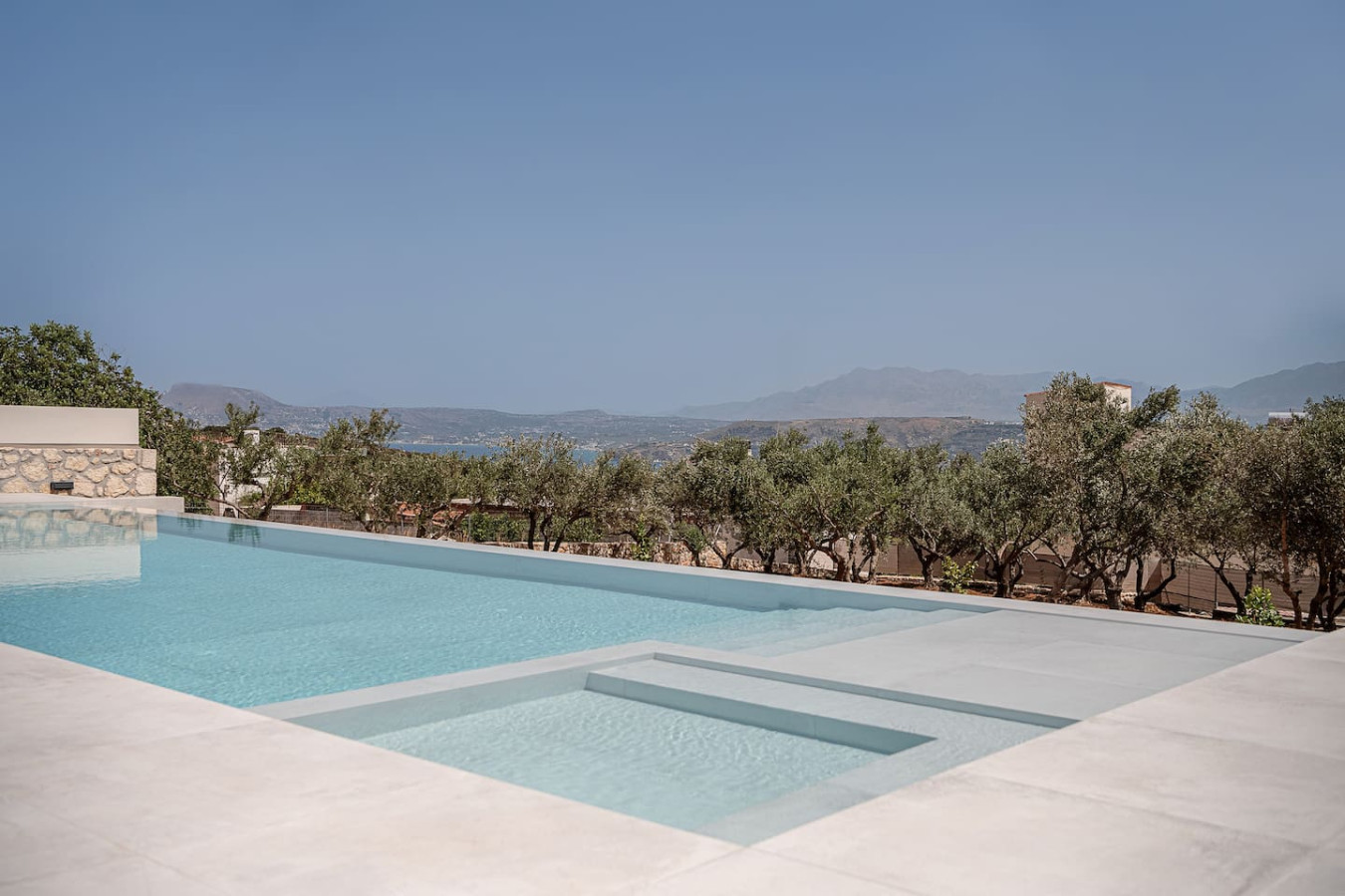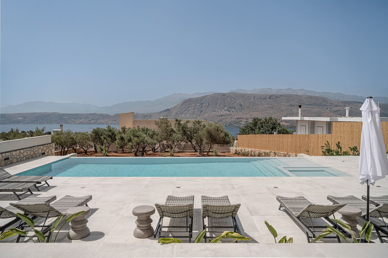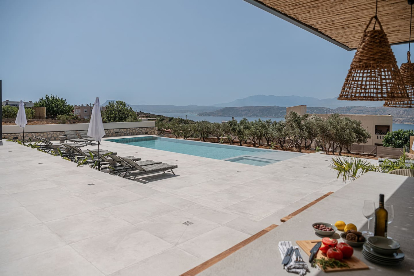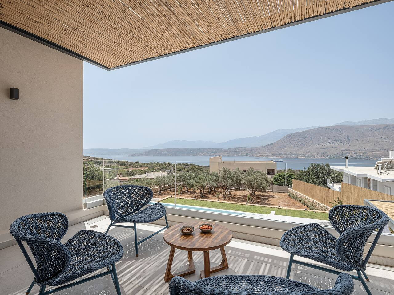 A panoramic balcony overlooks the infinity pool and Souda Bay — the perfect spot to enjoy the sunset.