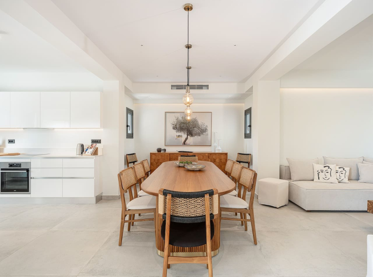 A spacious living room with a 65” Smart TV opens directly to the pool area. The dining area and fully equipped kitchen connect seamlessly to the outdoors.