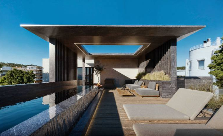 The highlight of the property is its private 60 sqm roof garden with a swimming pool, offering breathtaking panoramic views over the sea — an ideal setting for entertaining or enjoying the Mediterranean lifestyle in total privacy.