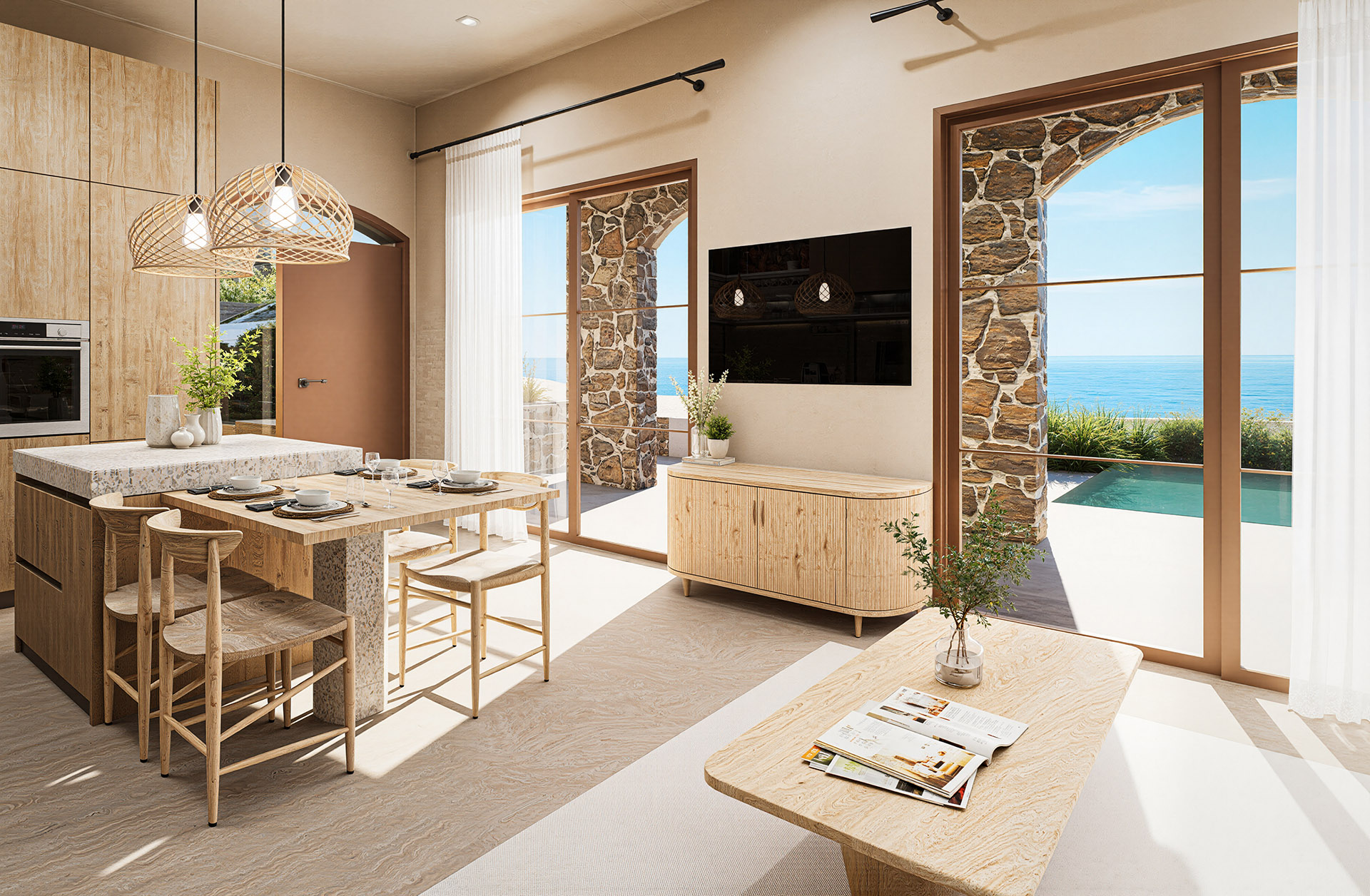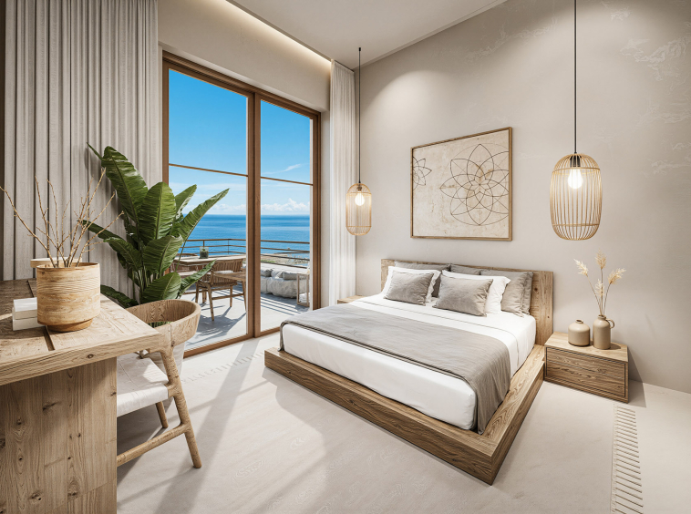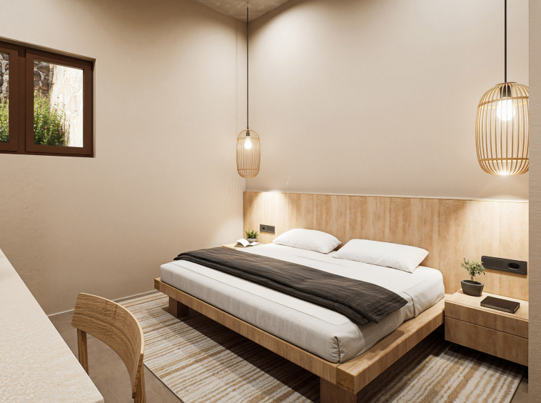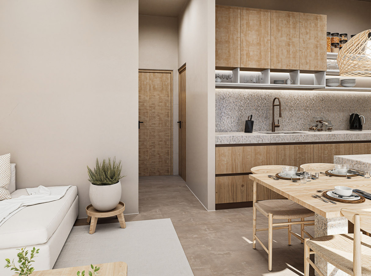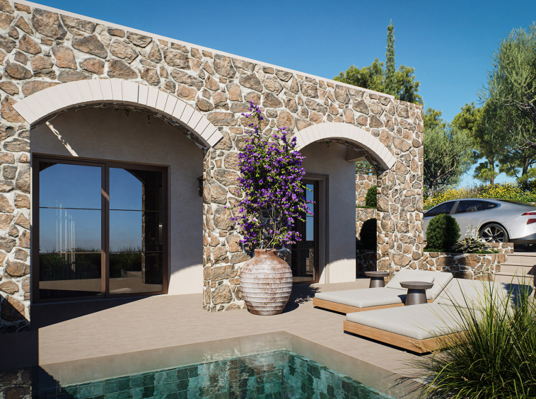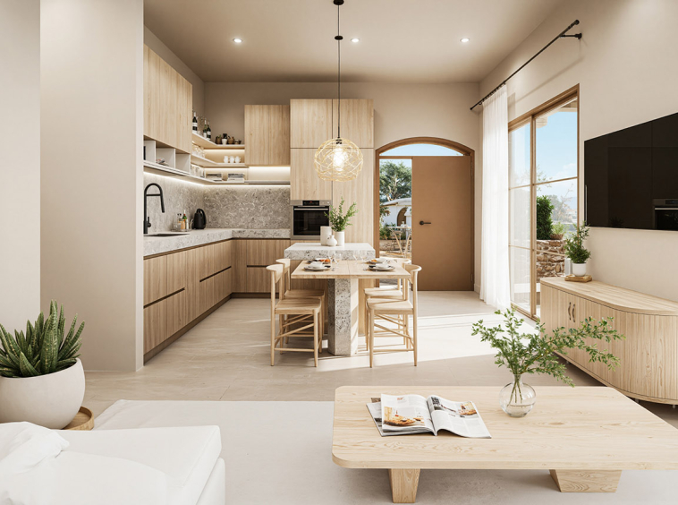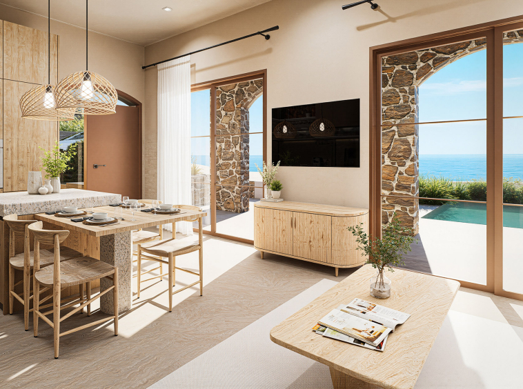 The villa features two well-proportioned bedrooms with generous openings and two modern bathrooms finished with high-quality materials. The open-plan living and kitchen area is bright and welcoming, designed to maximise natural light and flow. Clean architectural lines, natural textures and a carefully balanced interior palette create an atmosphere of understated luxury suited both for everyday living and hospitality use.
