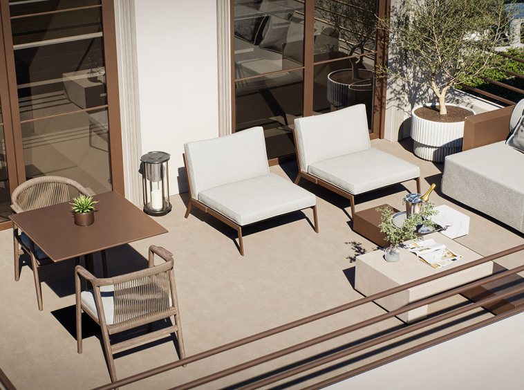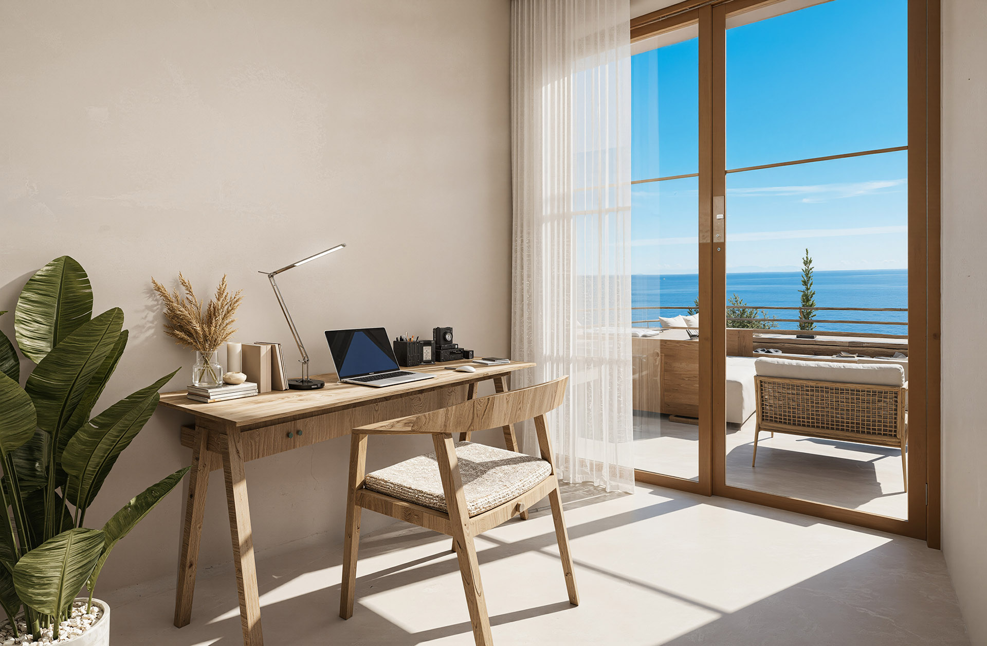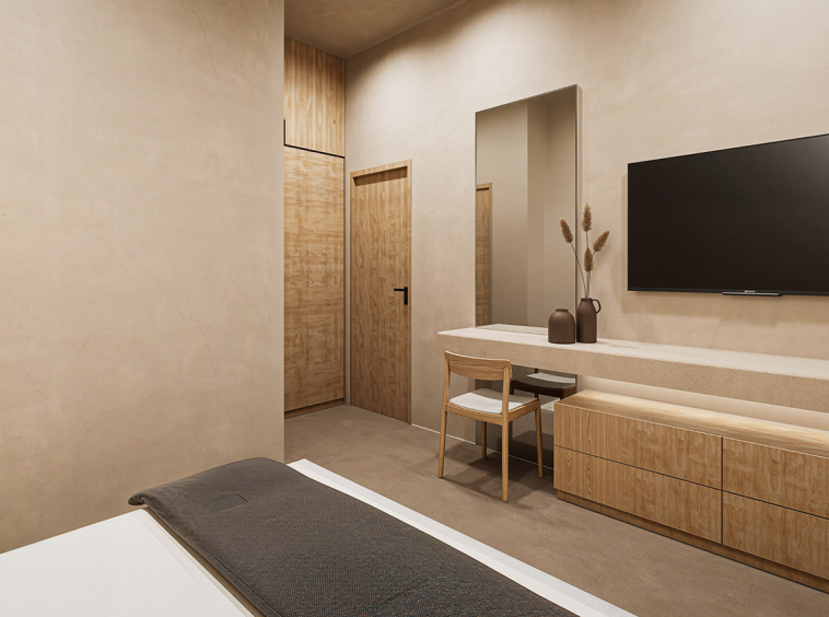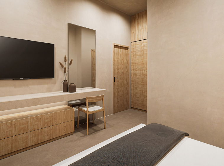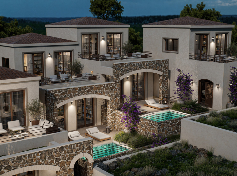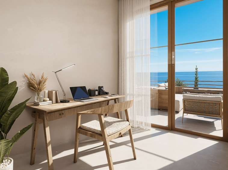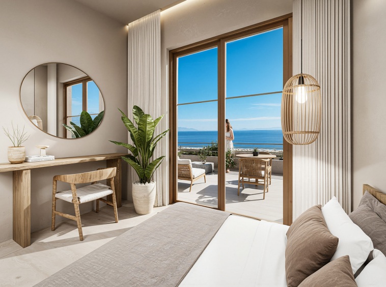 The villa features two well-proportioned bedrooms with generous openings and two modern bathrooms finished with high-quality materials. The open-plan living and kitchen area is bright and welcoming, designed to maximise natural light and flow. Clean architectural lines, natural textures and a carefully balanced interior palette create an atmosphere of understated luxury suited both for everyday living and hospitality use.