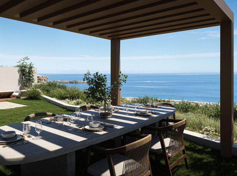 Outdoor living is an integral part of the design. The property includes a private swimming pool of 10.7 sq.m., a covered pergola area of 13.71 sq.m. ideal for dining or relaxation, and a private parking space of 15.8 sq.m. The landscaped garden is thoughtfully arranged using natural materials and planting that blend seamlessly with the surrounding landscape, ensuring tranquility, privacy and uninterrupted sea views.