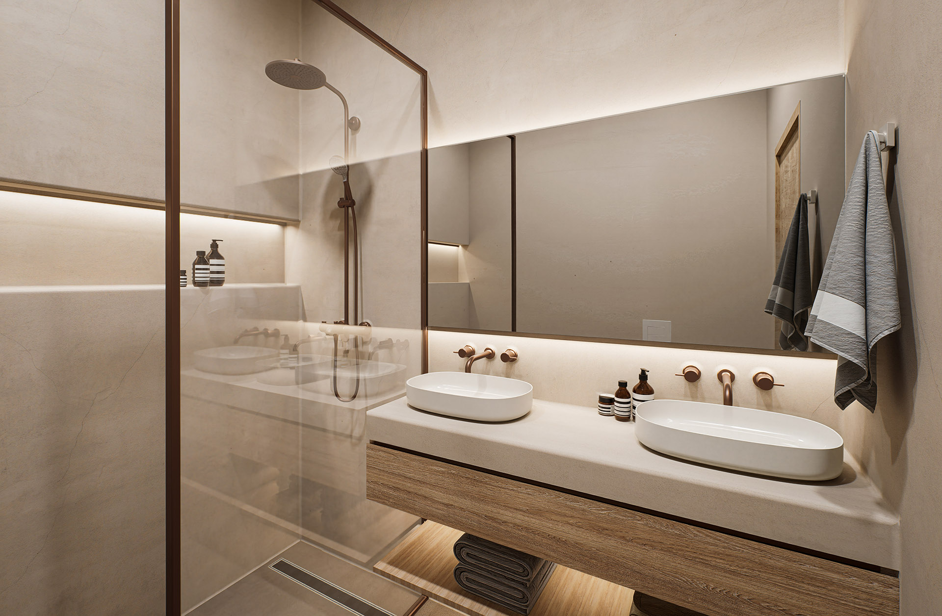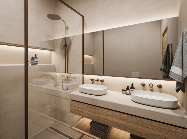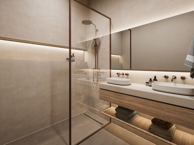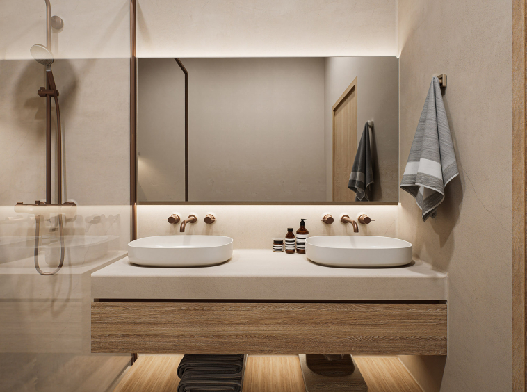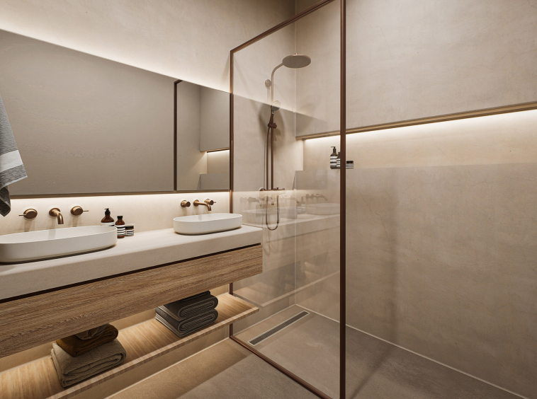 Oak and ceramic flooring, micro-cement bathroom finishes