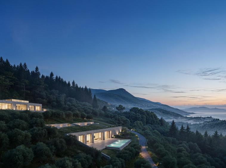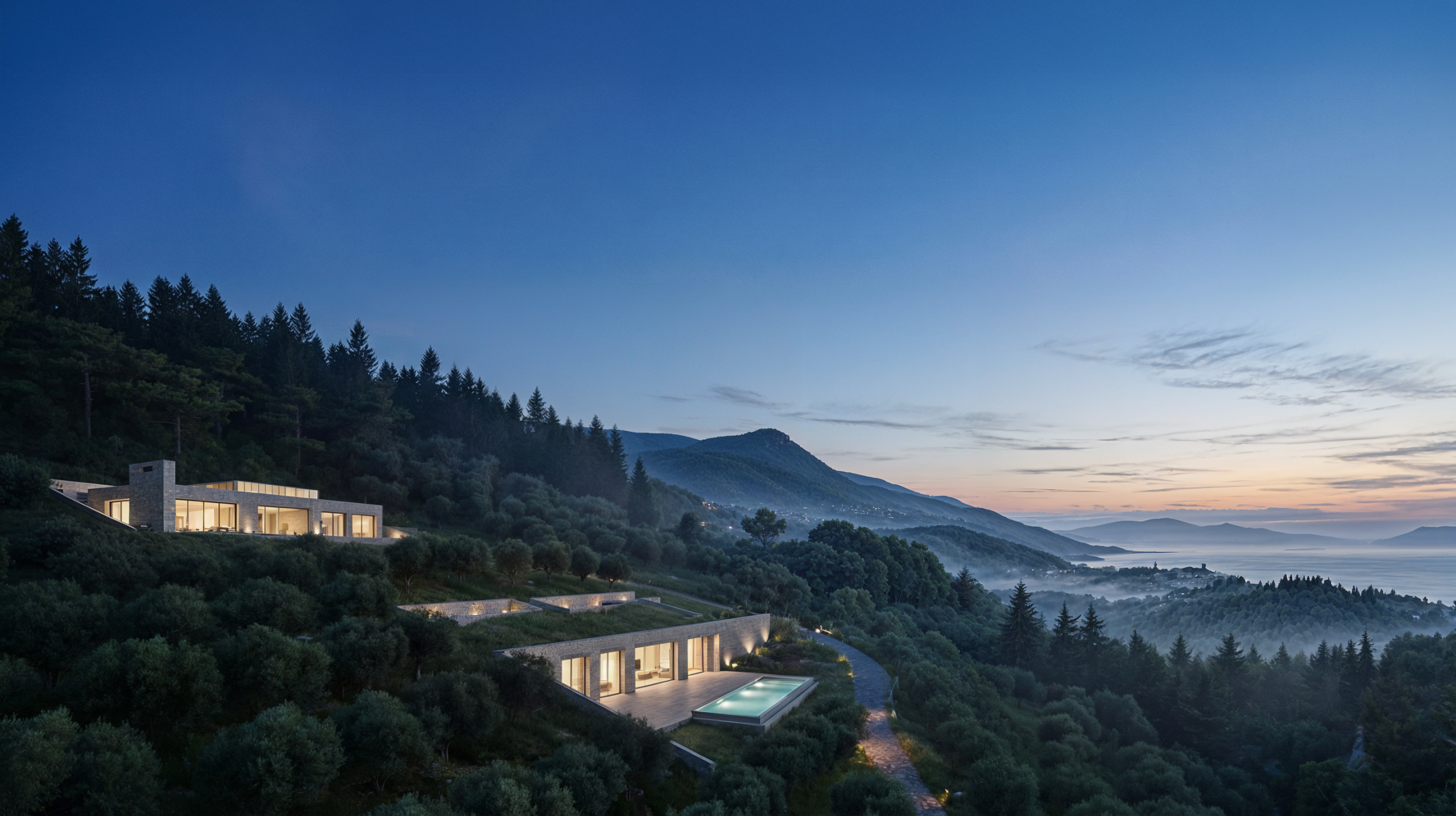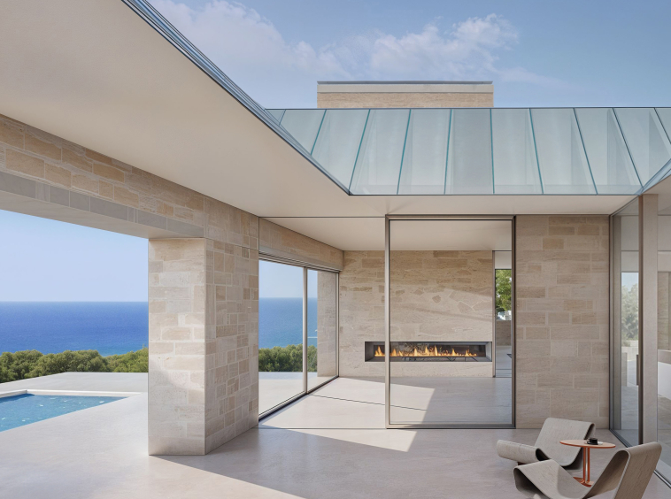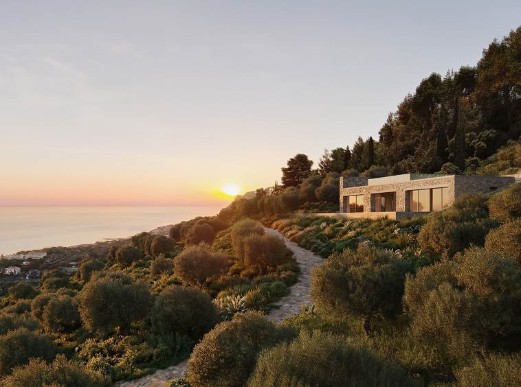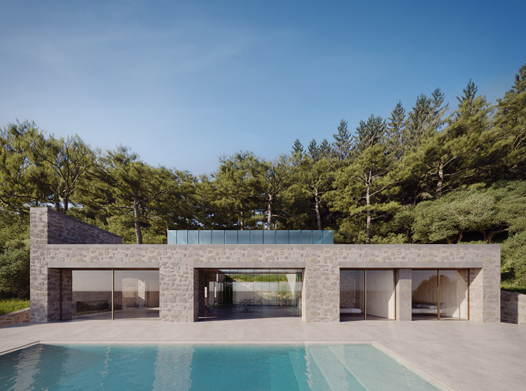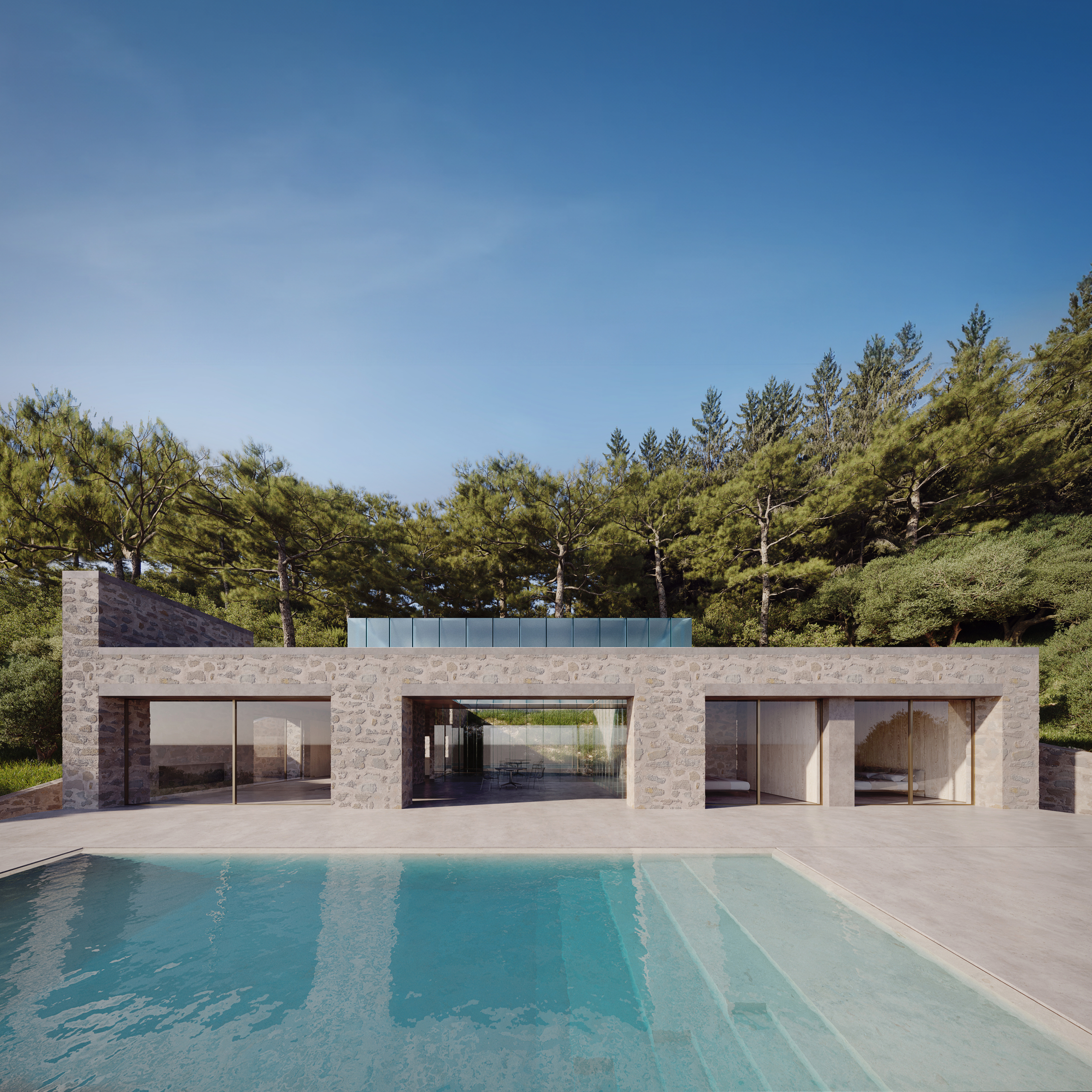 Materiality plays a key role in integrating the villa into its surroundings. The project utilizes a combination of natural stone and contemporary finishes, reflecting the grey-green tones of the terrain.