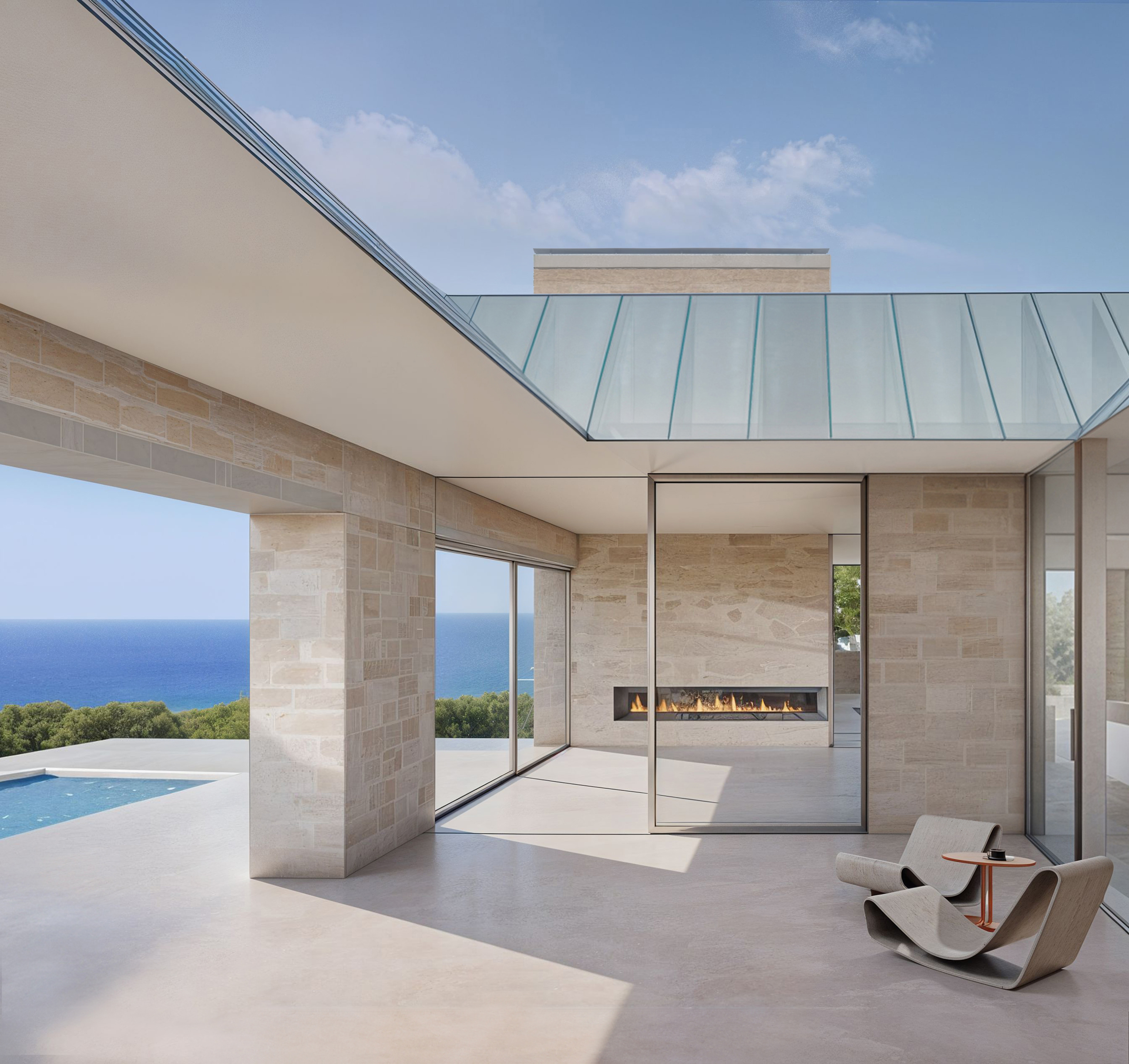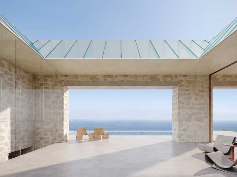 The design emphasizes the relationship between interior and exterior through the use of large openings, controlled light and carefully framed views toward the Ionian Sea.
