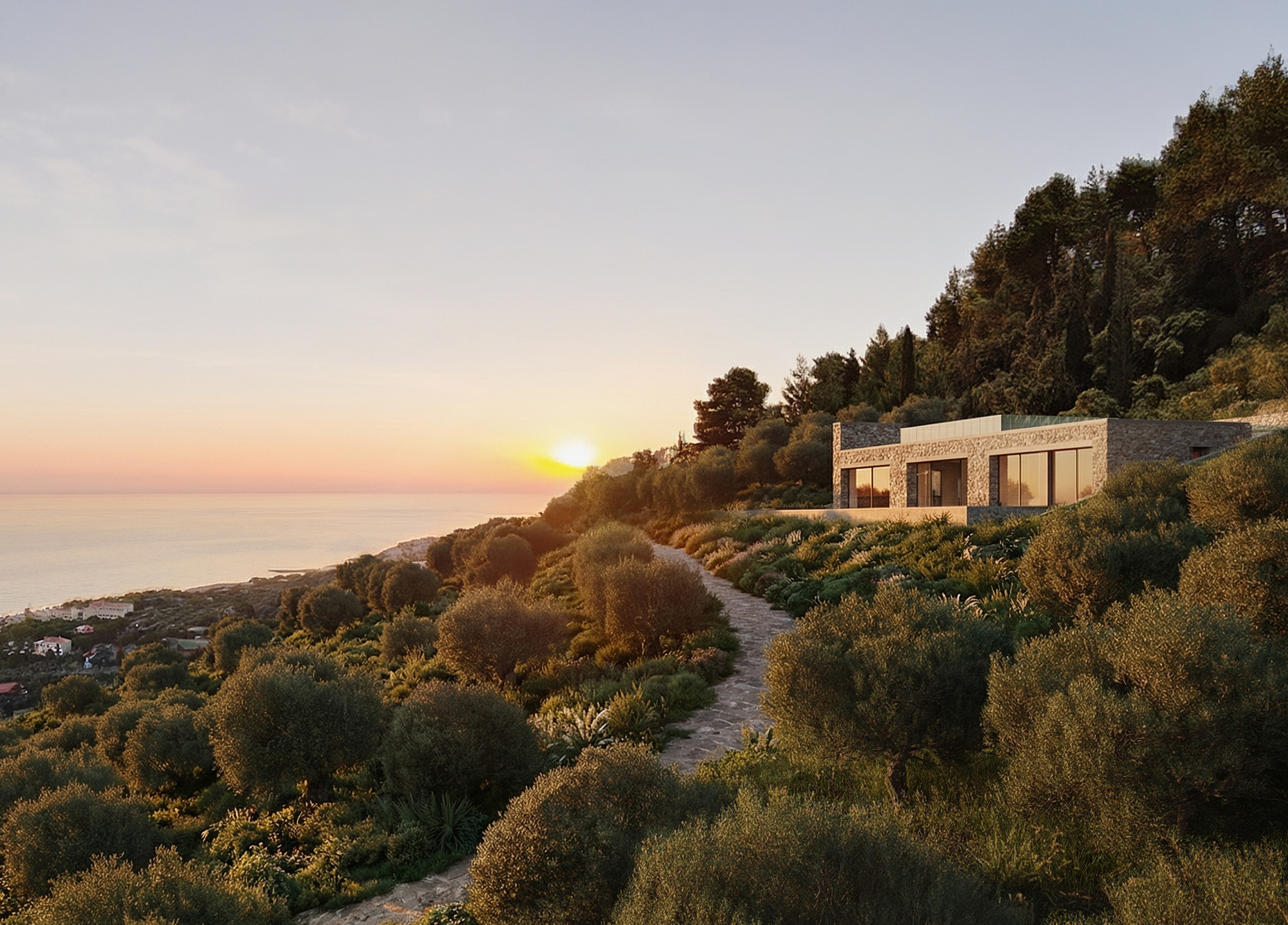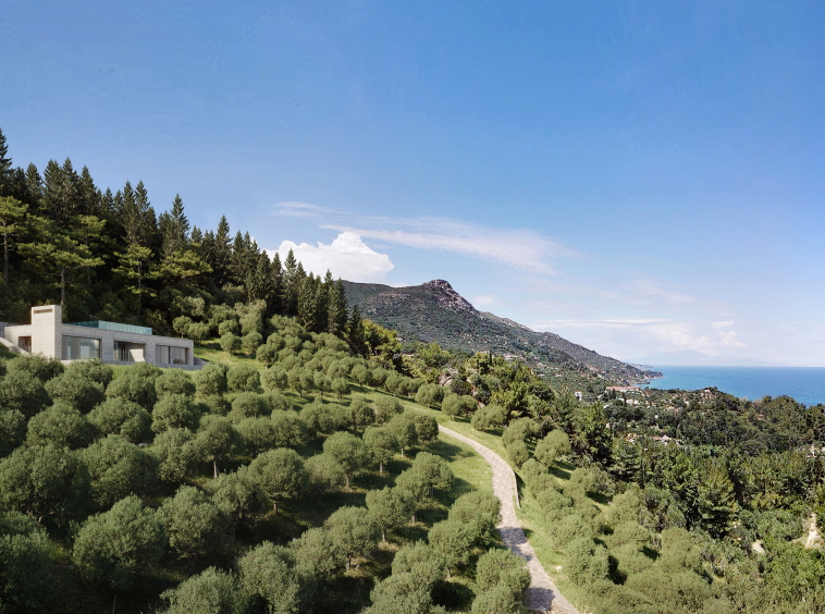 The villa is set on a 6,600 sq.m. plot, uniquely positioned between a productive olive grove and a natural pine forest, creating a rare combination of agricultural landscape and coastal woodland.