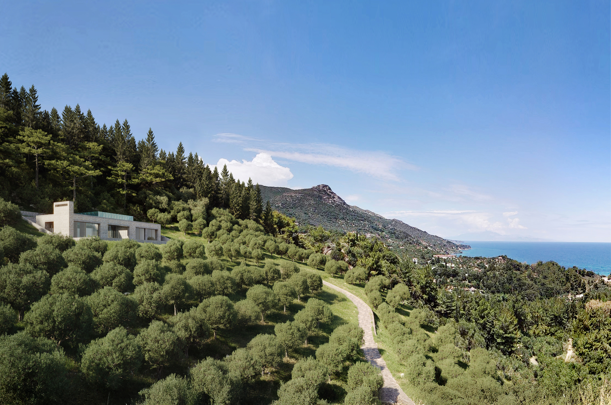 The villa is positioned at the transition point between the olive grove and the pine forest, where the built structure acts as a natural extension of the landscape.