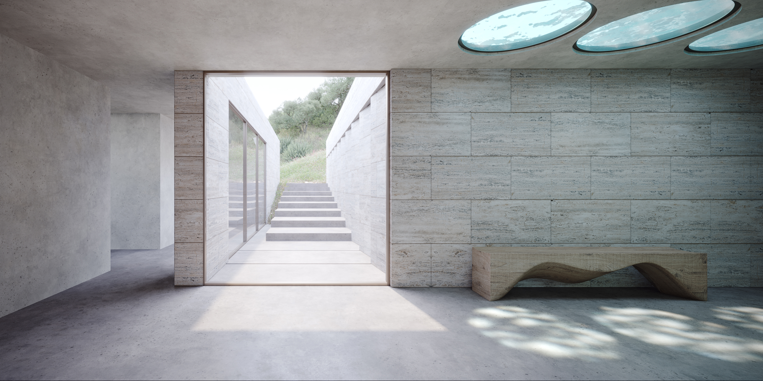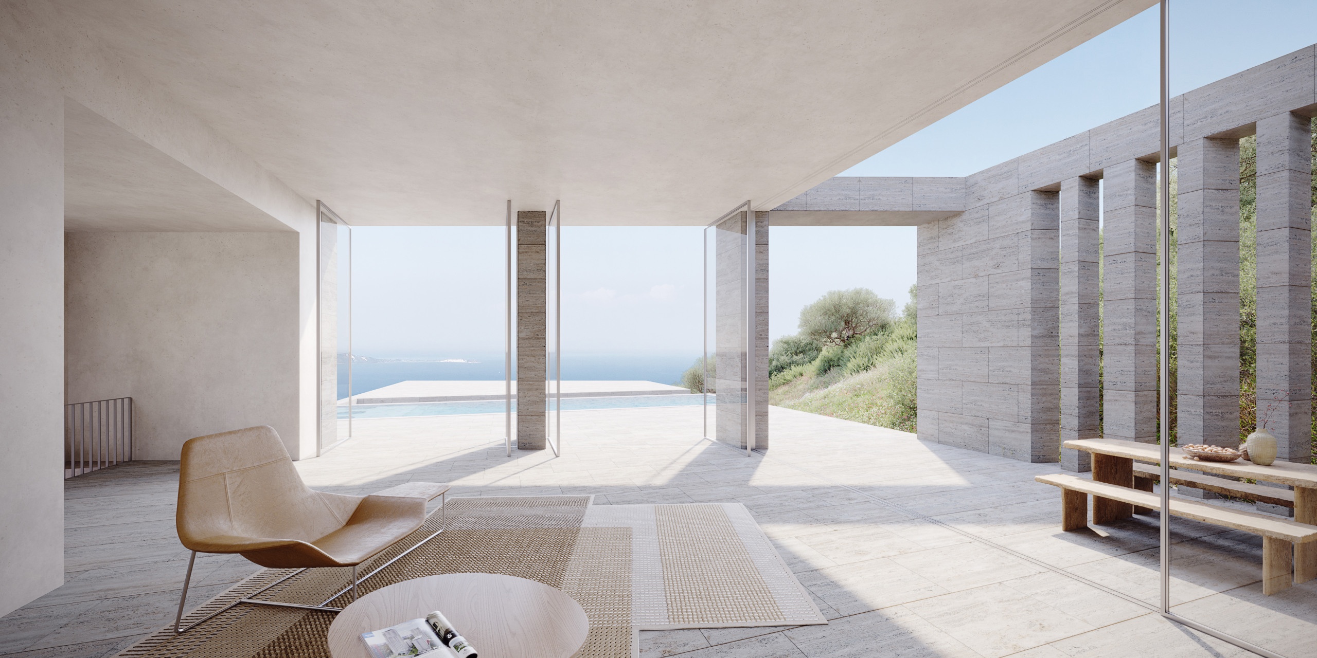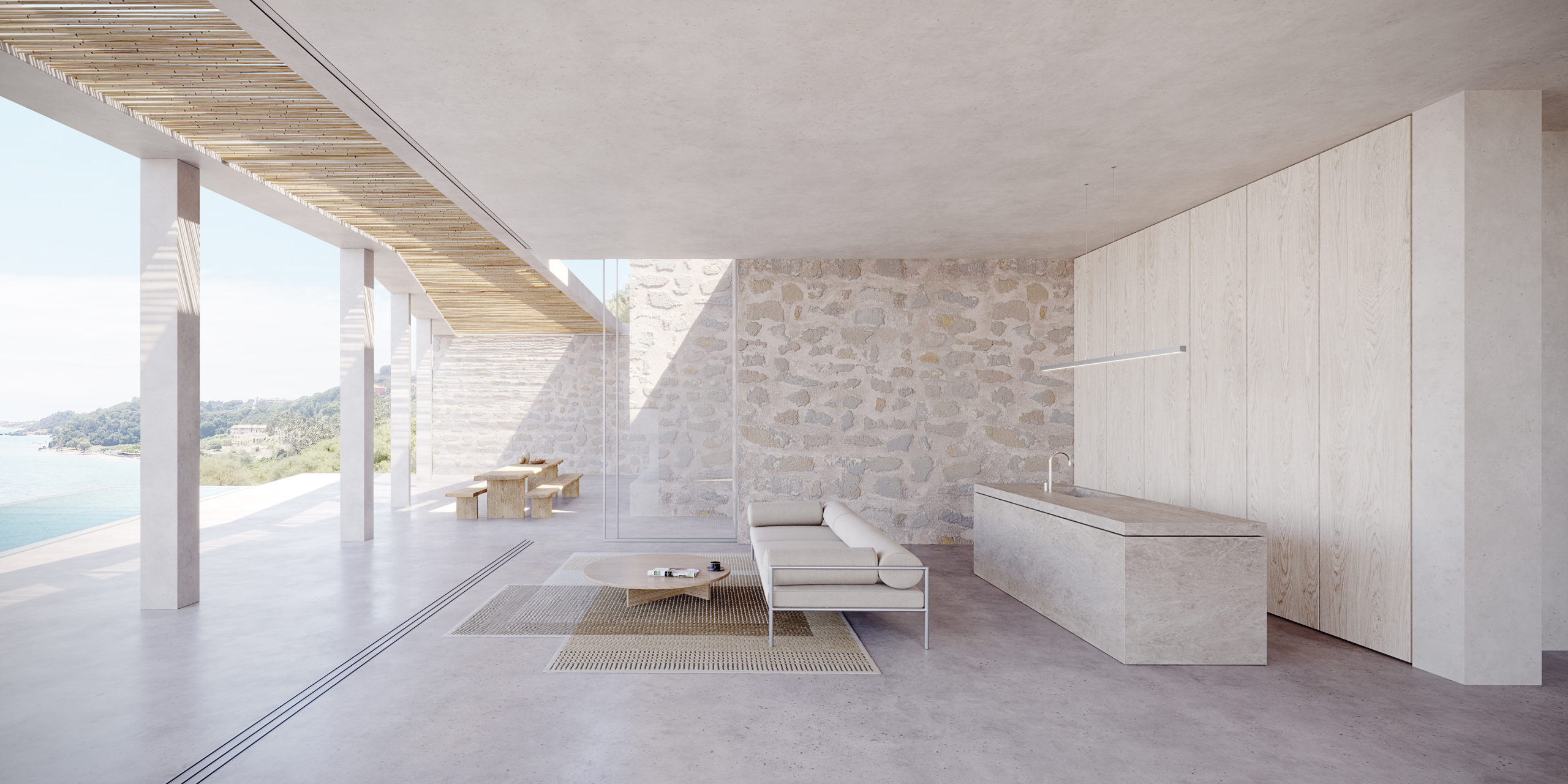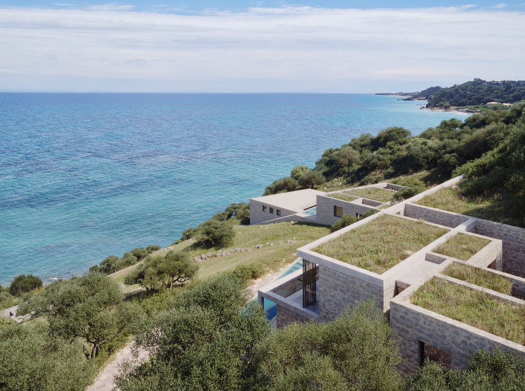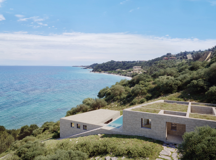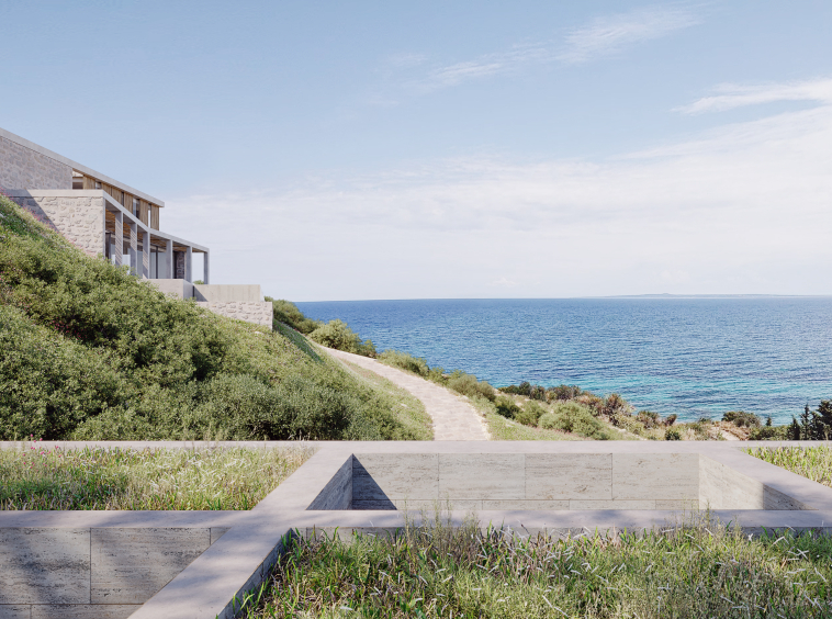 All primary spaces are oriented toward the sea, ensuring uninterrupted views, while a series of sunken courtyards at the rear introduce natural light into the interiors.