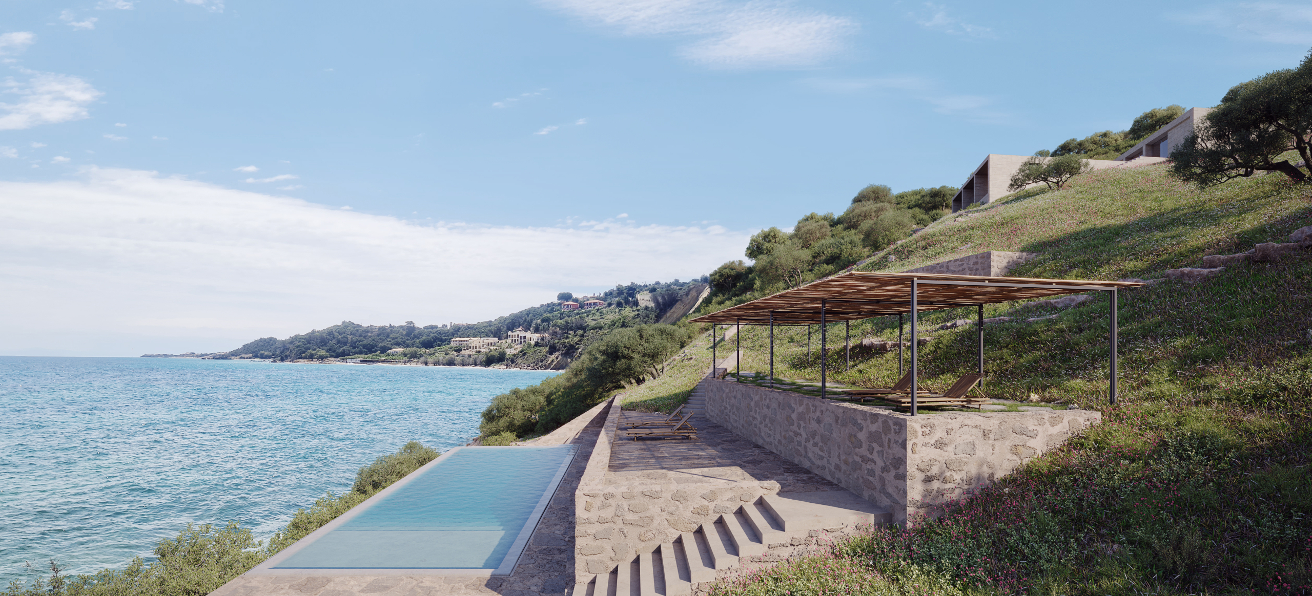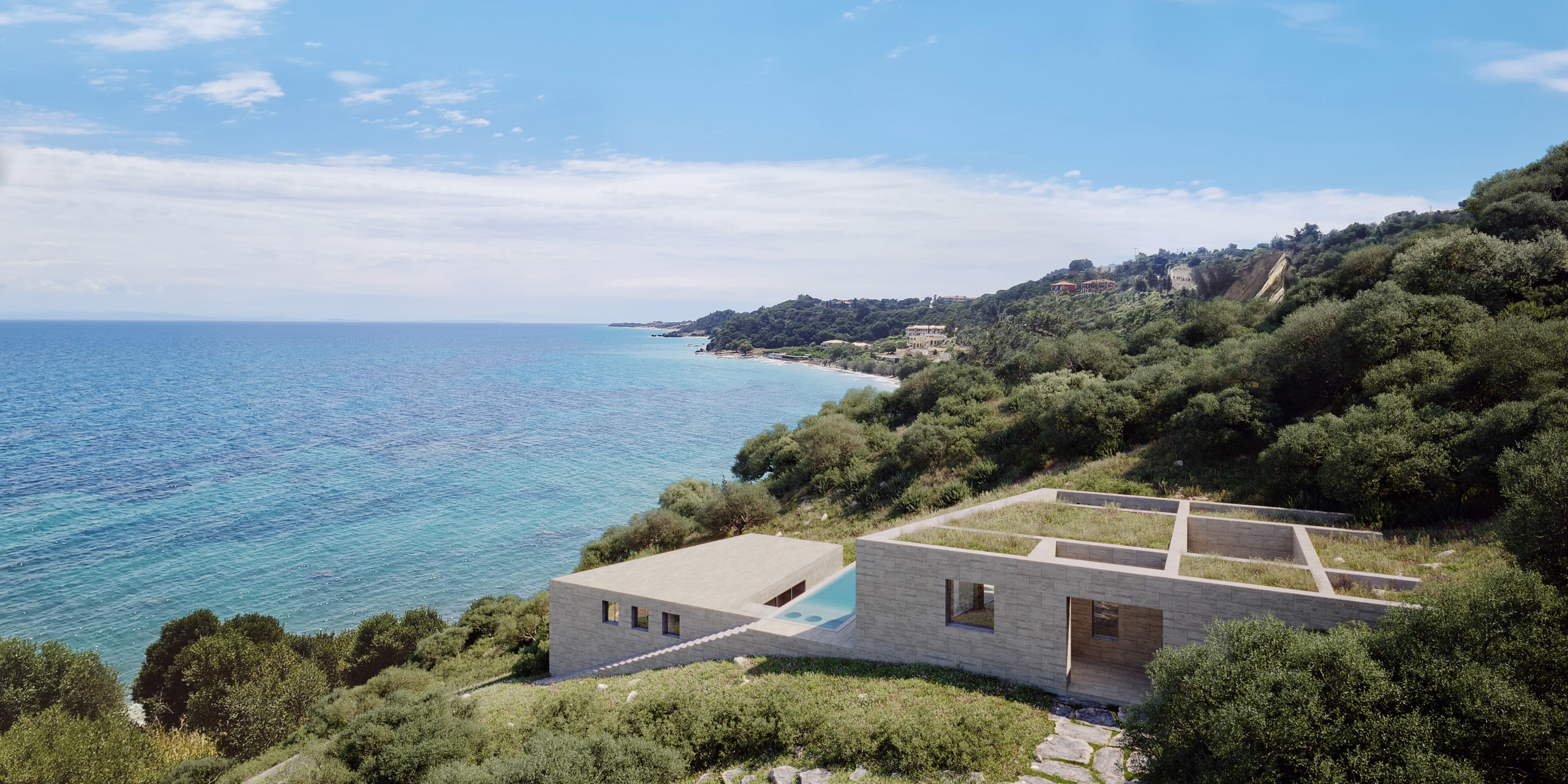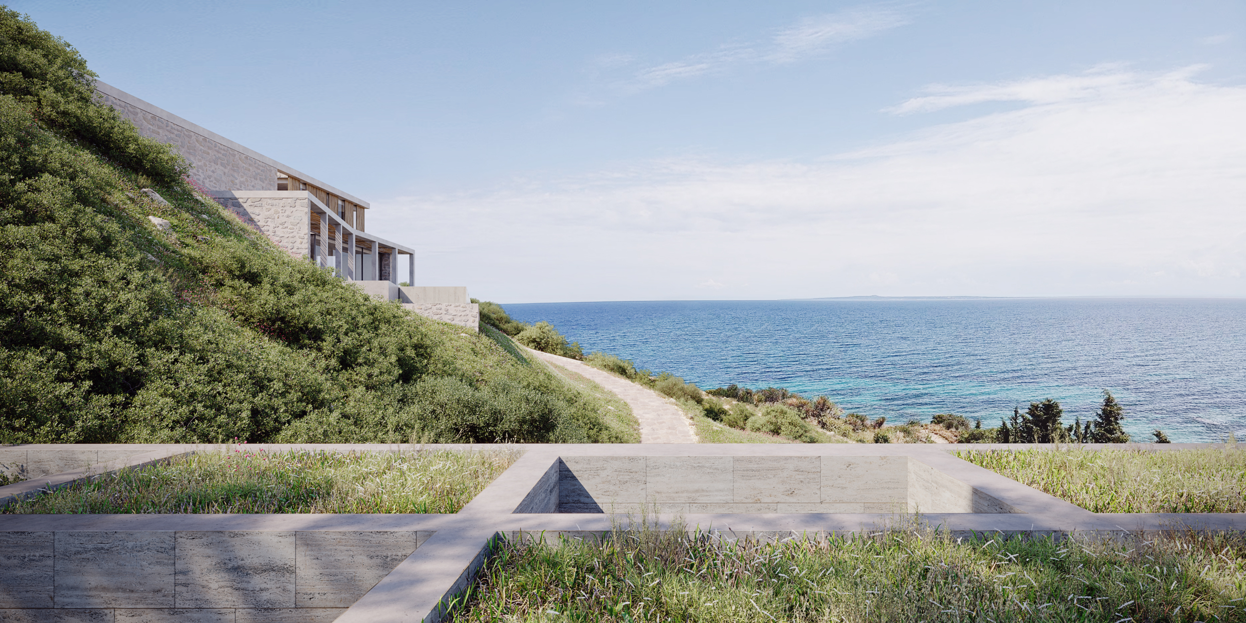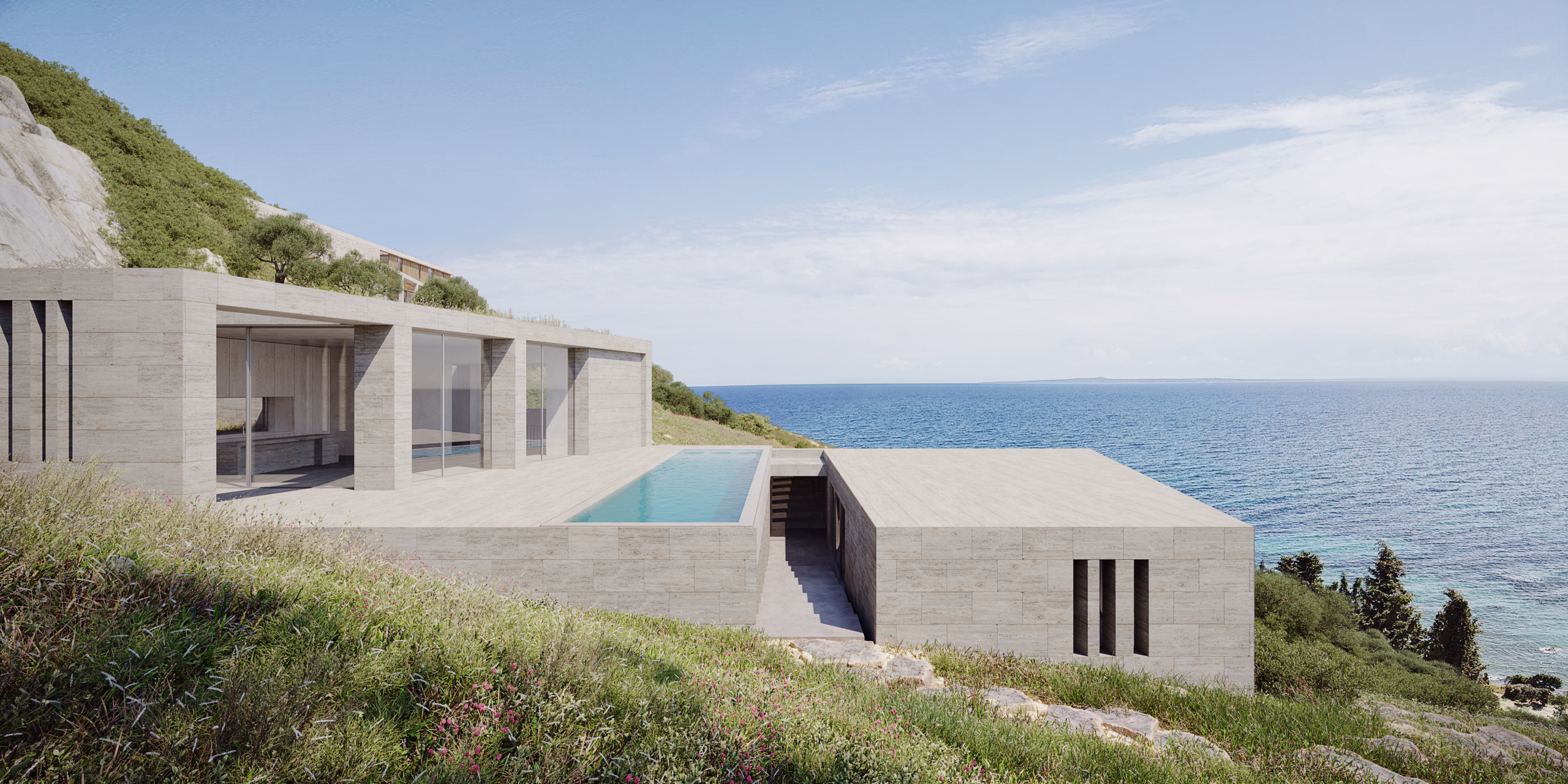 At the lower part of the plot, closer to the sea, a dedicated non-residential structure is designed as a pool and leisure area.