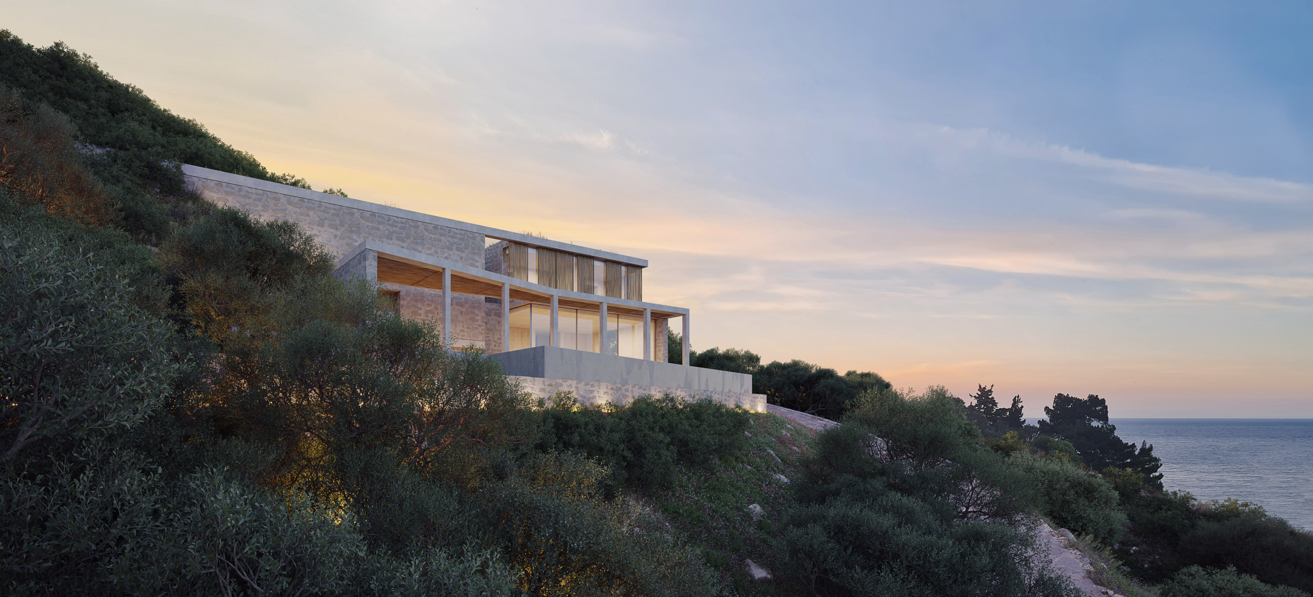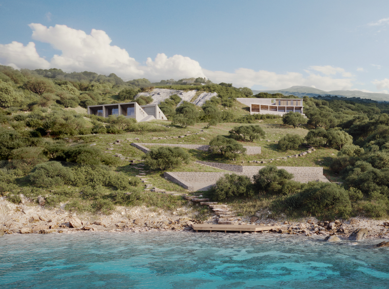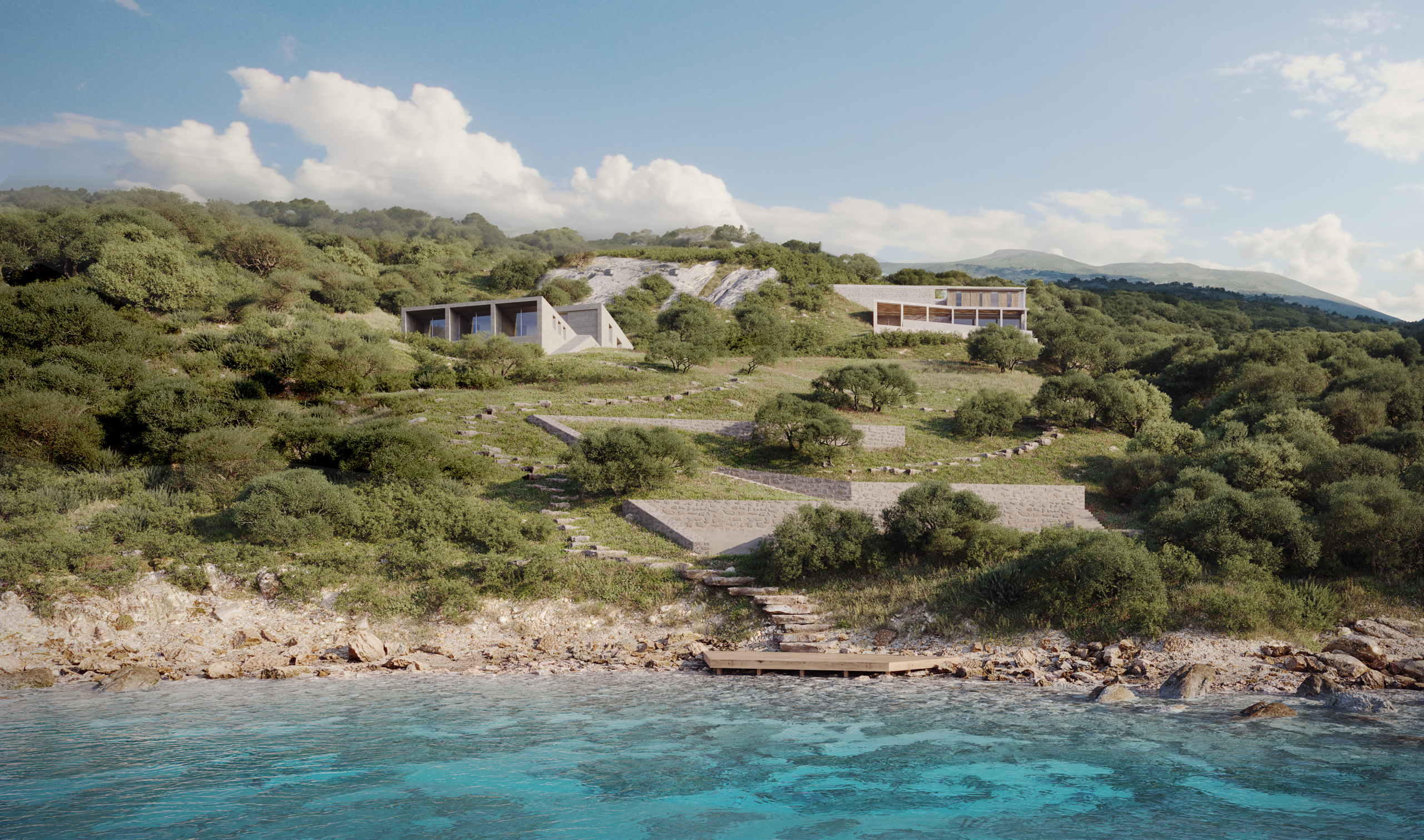 The development is designed as a two-villa residential complex, carefully integrated into the natural terrain to preserve both privacy and visual continuity with the surrounding landscape.