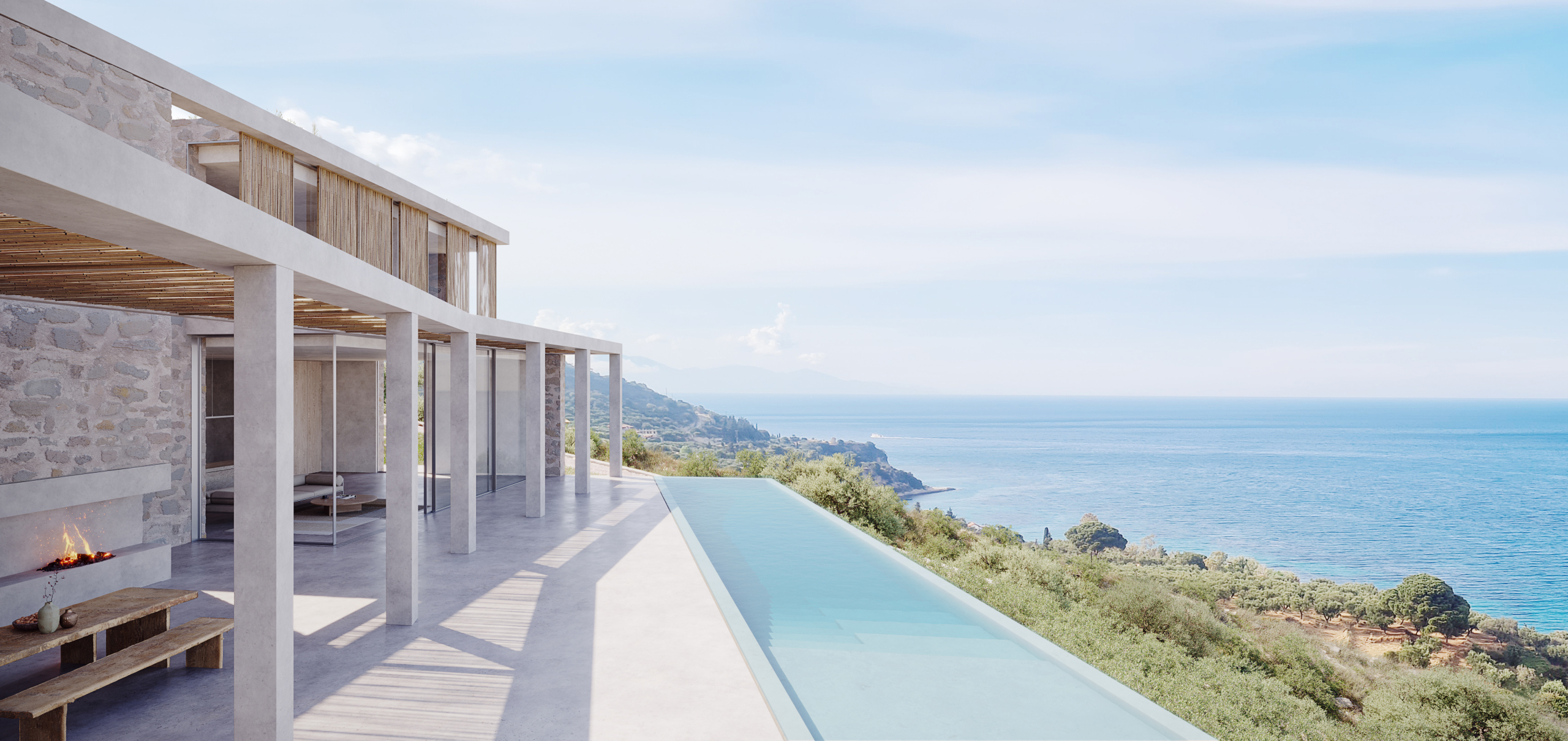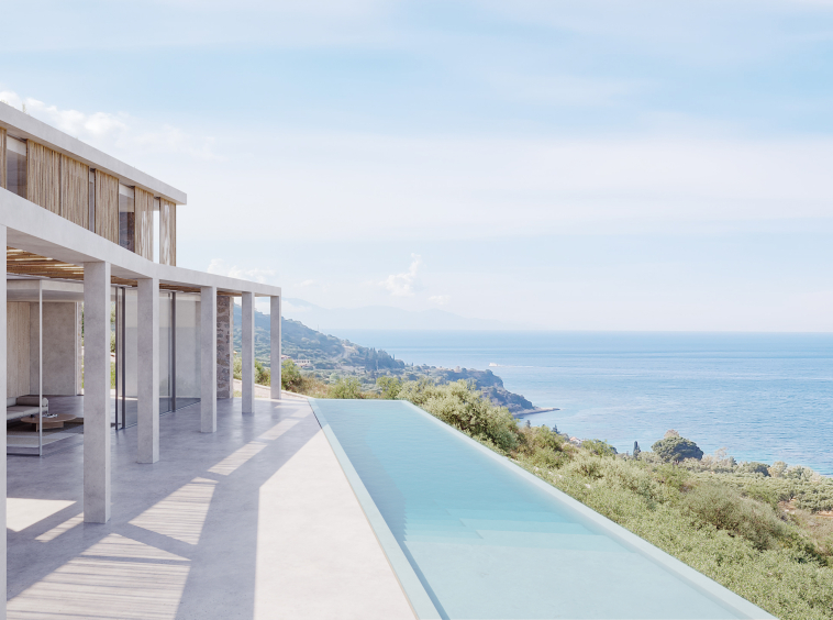 The living space opens onto a panoramic terrace with an infinity pool, creating a seamless indoor–outdoor experience overlooking the Ionian Sea.