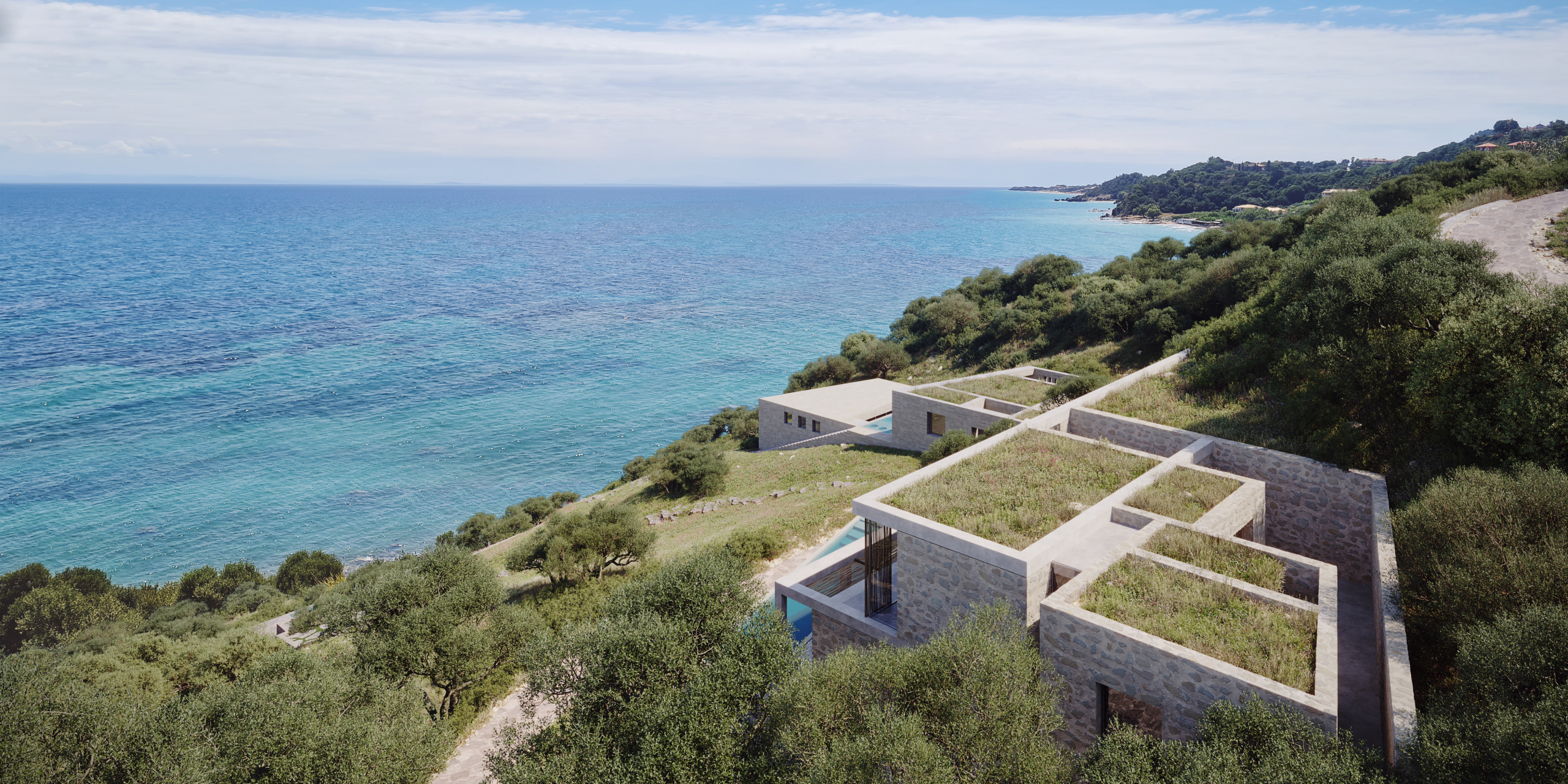 Positioned on a dramatic cliffside approximately 50 meters above sea level, the property offers completely uninterrupted panoramic views across the Ionian Sea, while maintaining direct access toward the coastline below.